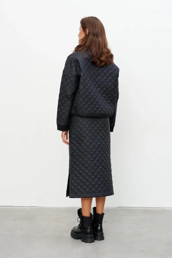 Комплект из стёганной плащёвки состоящий из бомбера и юбки миди. Бомбер с трикотажной стойкой по горловине и манжетами. По низу на кулисе со шнуром и фиксаторами. Спереди два кармана и застёжка на металлическую молнию. На груди слева настрочен декоративный шеврон.