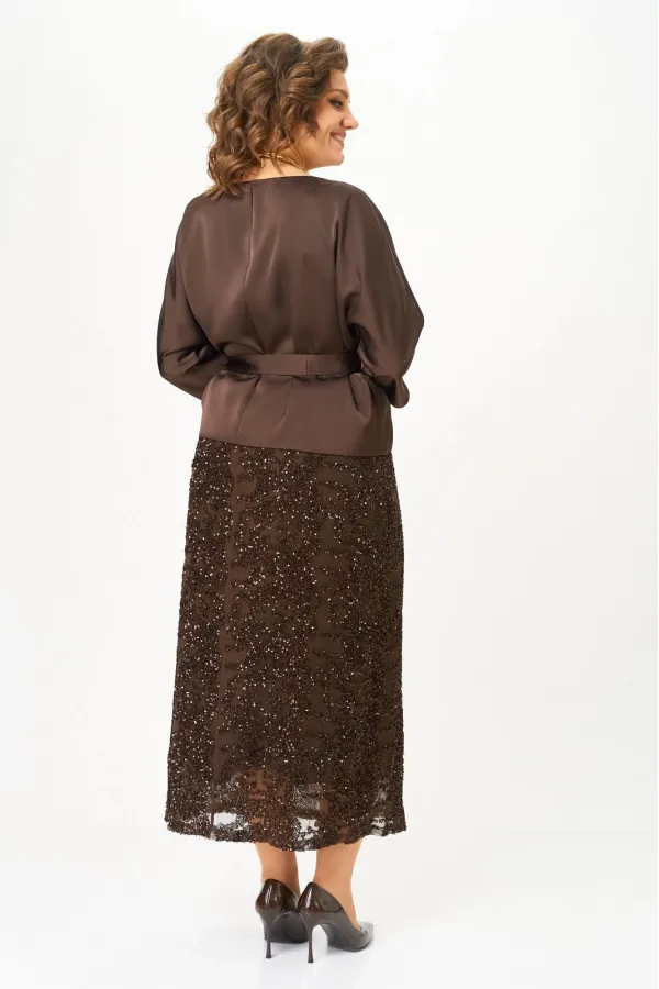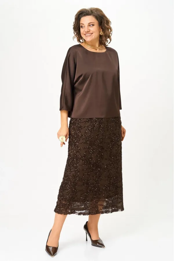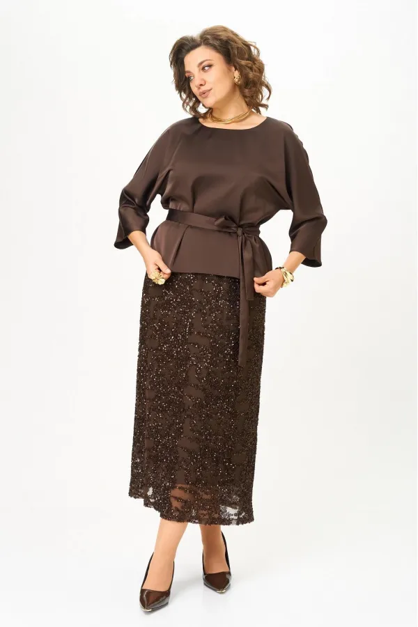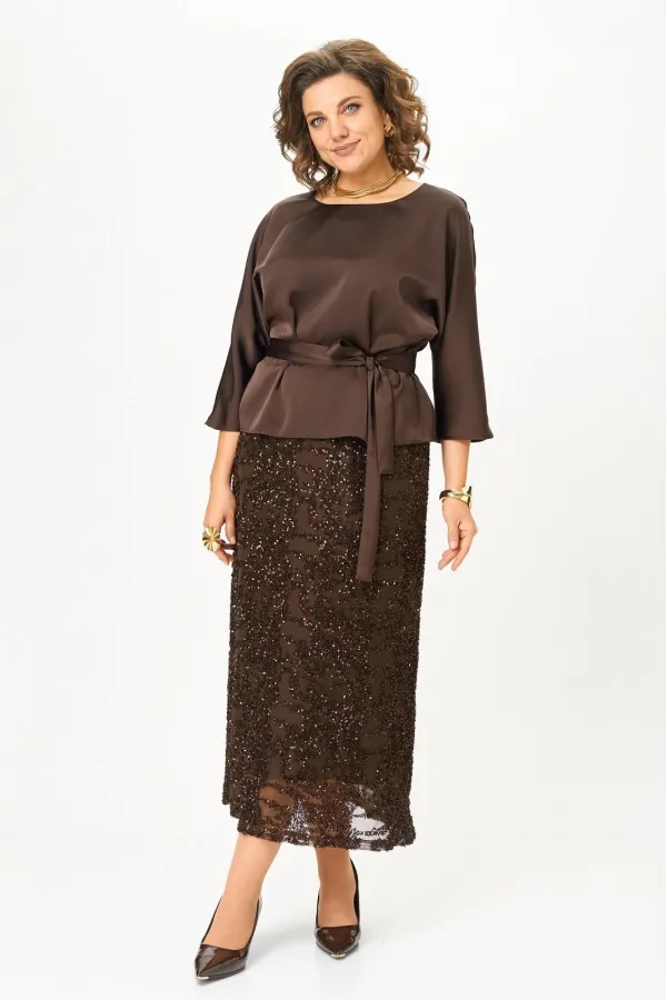 Нарядный женский комплект, состоящий из блузы и юбки. Блуза из атласной ткани с добавлением шелка, с цельнокроенным рукавом 3/4, вырез горловины лодочка с застежкой на петлю с пуговицей по спинке, пояс съемный на завязку. Юбка прямая двойная, верхний слой - сетка с паетками, нижний - атлас, пояс отрезной по талии.