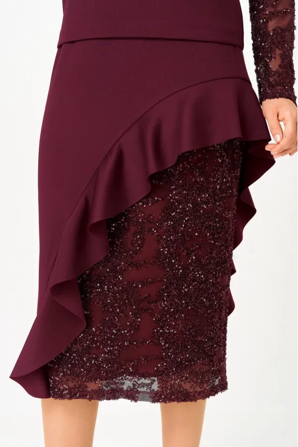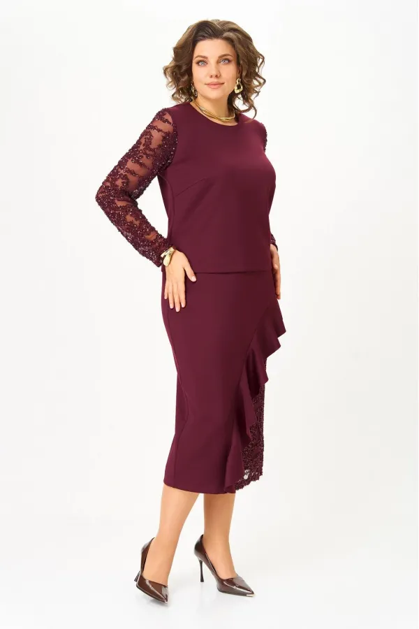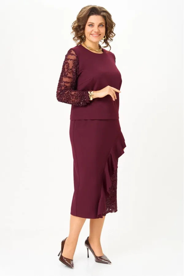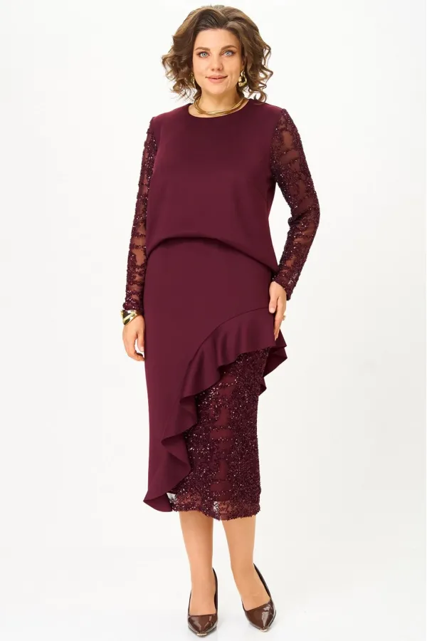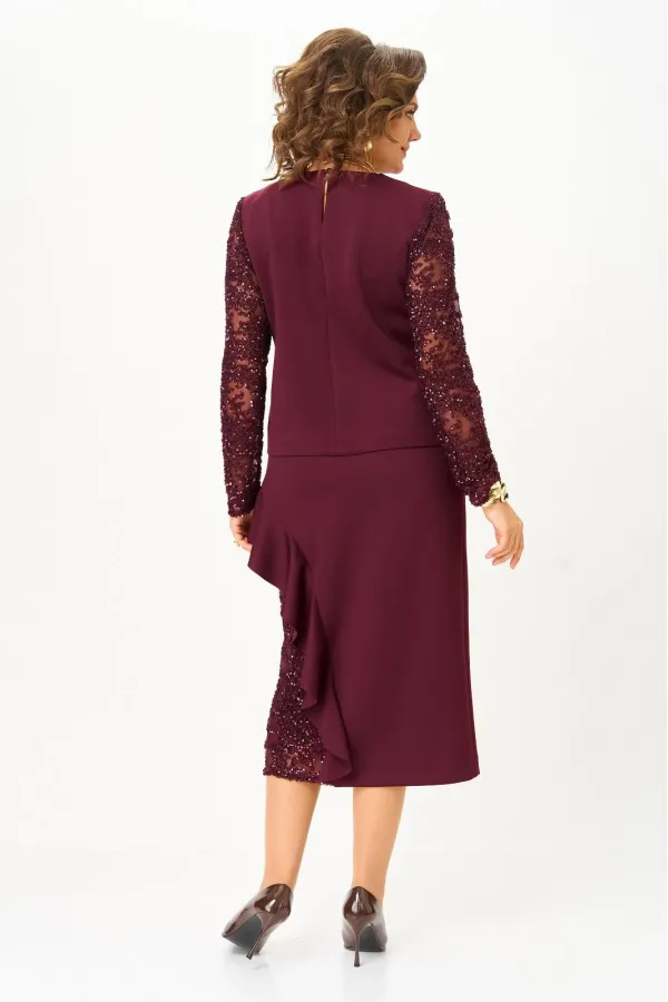 Нарядный женский комплект. Состоящий из блузона и юбки. Комплект выполнен из трикотажного полотна с добавлением хлопка. Блузон укороченный, свободного облегания, вырез горловины круглый, с застежкой на навесную петлю с пуговицей по спинке, рукав из трикотажной сетки с паетками. Юбка удлиненная, прямая, на подкладке, сбоку по низу переда и спинки фигурная вставка из трикотажной сетки с паетками и воланом.