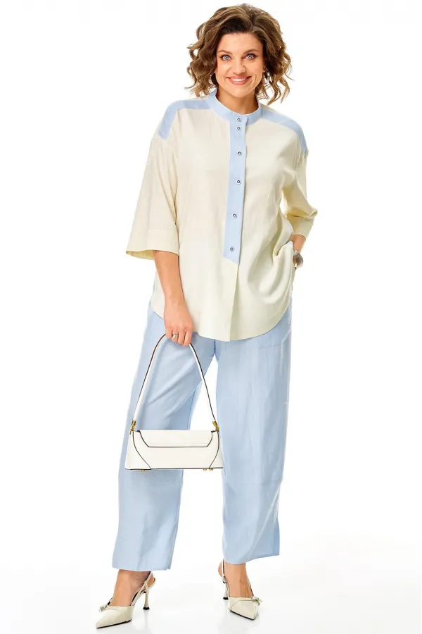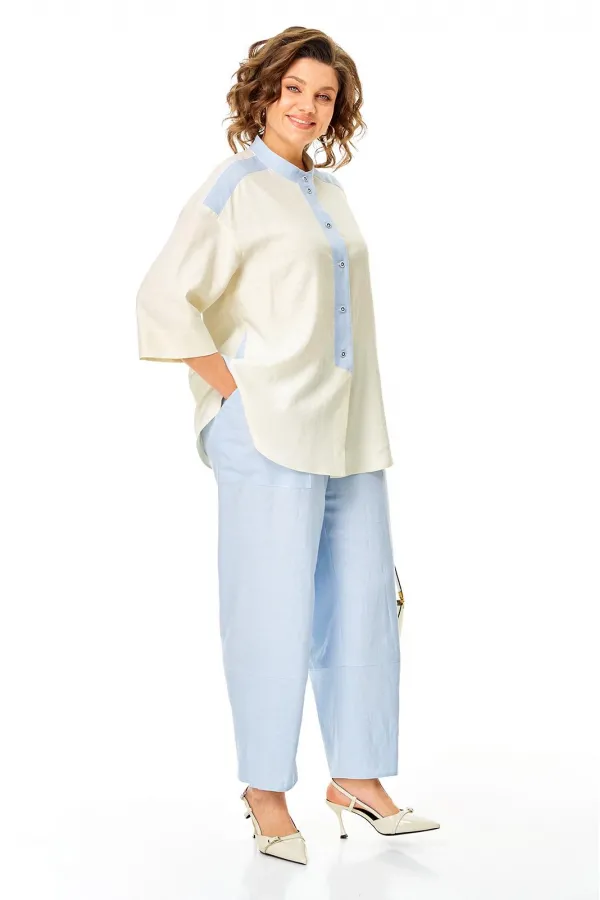 Легкий , стильный, комфортный ! Брючный костюм из натуральной ткани с высоким содержанием льна, вискозы . Идеальный выбор современной женщины ! Блузон свободного кроя с контрастной отделкой и продуманными конструктивными линиями, воротник стойка, декоративная планка, спущенный рукав , фигурный низ , придают образу особый шарм. Брюки модного кроя баги на резинке без застежки , с карманами , по низу декоративные подрезы . Возможна замена фурнитуры.