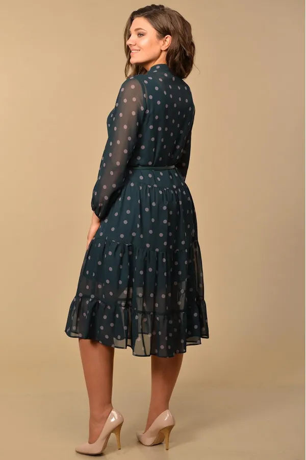 Комплект 2-х предметный, состоит из платья и туники. Платье А - силуэта, с круглым вырезом горловины, обработанного воротником стойкой. Лиф переда с нагрудными вытачками, центральной супатной застежкой. По низу платья воланы со сборкой. Рукава втачные, одношовные, с резинкой по низу. Туника прямого силуэта, с круглым вырезом горловины, нагрудными вытачками по переду. Платье комплектуется съемным поясом. Размеры 48-52: длина туники 81 см, длина платья 115 см, длина рукава платья 57 см. Размеры 54-58: длина туники 83 см, длина платья 117 см, длина рукава платья 58 см.