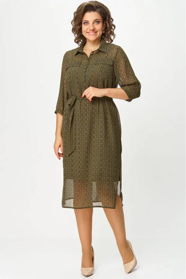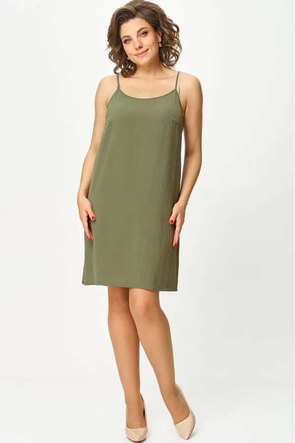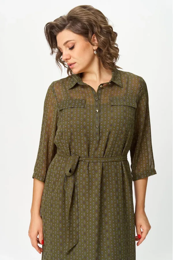 Женский комплект 2-х предметный, состоит из туники и платья. Платье прямого силуэта, с круглым вырезом горловины, обработанного стояче-отложным воротником с отрезной стойкой. Перед с нагрудными вытачками, застежкой-планкой на петли и пуговицы. Рукава втачные, одношовные, длиной 3/4. Туника прямого силуэта, на бретелях. Перед с нагрудными вытачками. Платье комплектуется съемным поясом.