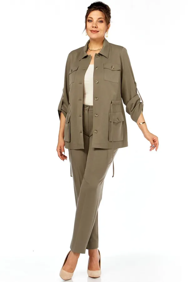 Элегантный костюм. Офисный деловой вариант. Костюм женский 2-ух предметный, состоящий из жакета и брюк, из костюмного материала. Жакет прямого силуэта, без подкладки, с нагрудными вытачками от боковых швов, удлиненный. Воротник рубашечного типа с острыми концами и отрезной стойкой. Нижняя часть спинки цельная. По линии талии настрочена наружная кулиска с поясом из окантовки. Рукава втачные, длинные, одношовные. Брюки прямого силуэта, частично на резинке, слегка зауженные книзу. Застежка по переду на тесьму - молнию и одну петлю и пуговицу. Разрезы внизу в боковых швах.