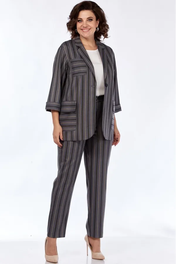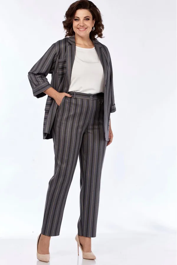 Костюм женский стильный офисный деловой брючный. Костюм брючный трех предметный. Состоит из жакета, блузы (полиэстер 100%) с коротким рукавом и брюк. Жакет прямого силуэта, без подкладки, удлиненный. Воротник пиджачного типа. Центральная застежка на петлю и пуговицу в размерах 48-52 и на две пуговицы 54-58. Детали переда с нагрудными вытачками, с большими накладными карманами с закругленными концами и клапанами, переходящими на спинку. На правой детали переда нагрудный накладной карман. Спинка со средним швом. Рукава втачные одношовные длиной 3/4. Низ рукавов с отложными манжетами. Карманы, клапаны, манжеты из отделочного материала. Блуза прямого силуэта, с круглым вырезом горловины, короткими цельнокроенными рукавами. Длина блузы по спинке 62-65 см. Брюки заужены к низу. Верхний срез брюк обработан притачным поясом, застегивающимся на петлю и пуговицу, по спинке на широкой эластичной тесьме. Центральная застежка на тесьму-молнию. Наклонные карманы в боковых швах. Задняя часть брюк с талиевыми вытачками, имитацией карманов с листочкой. С разрезами по низу.