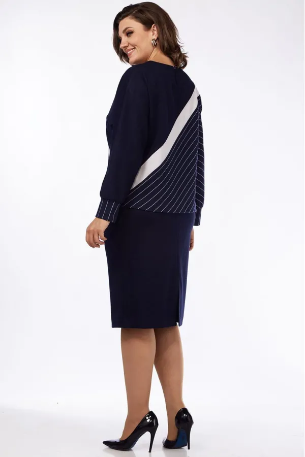 Костюм женский 2-х предметный, состоящий из туники и юбки, из трикотажного полотна. Туника женская с цельнокроеными длинными рукавами, по низу с притачными манжетами. С круглым вырезом горловины, по спинке вырез капелька, застегивающийся на навесную петлю и пуговицу. Перед и спинка с отделочной деталью из однотонного материала. В левом боковом шве разрез. Юбка прямого силуэта, с цельнокроеным поясом на резинке. Задняя часть юбки со средним швом и разрезом.