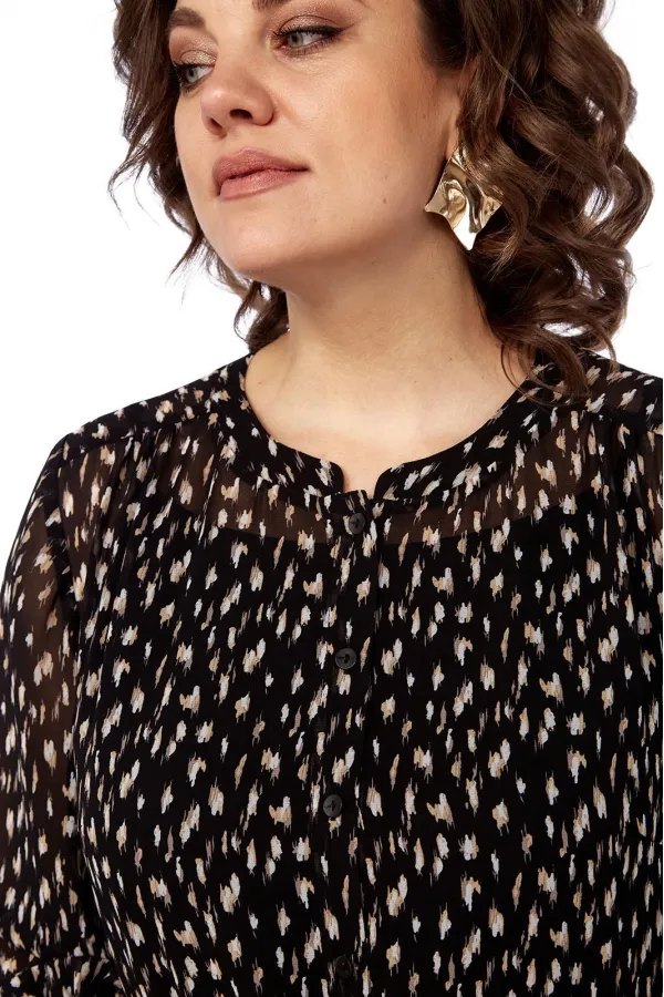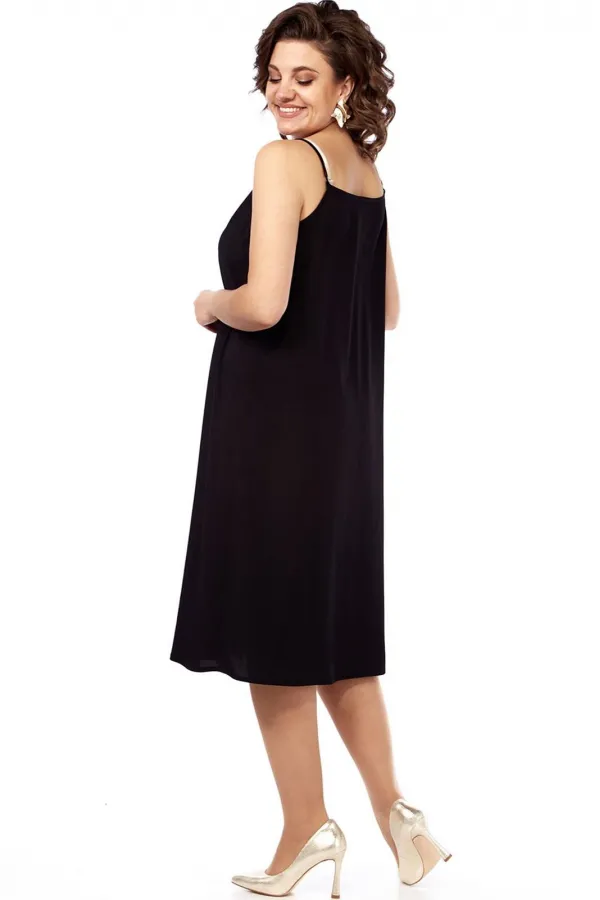 Женский комплект 2-х предметный, состоит из туники и платья. Платье А-силуэта, с круглым вырезом горловины, обработанного воротником-стойкой. Отрезное ниже линии талии , юбка со сборкой. Перед с нагрудными вытачками, центральной застежкой-планкой на петли и пуговицы. Спинка с кокеткой. Рукава втачные, одношовные, длиной 3/4, с манжетой по низу. Туника прямого силуэта, на бретелях. Бретели регулируются(длина туники ~113-118 см). Перед с нагрудными вытачками.