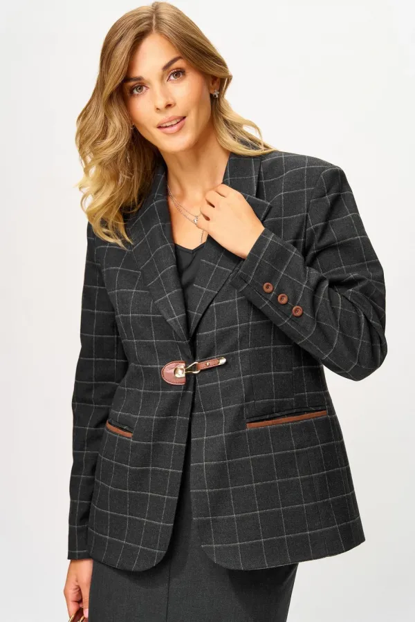 Жакет свободного силуэта, на подкладке, длиной ниже линии бедер. Воротник отложной пиджачного типа, застежка центральная на 1 декоративный элемент. Перед жакета с отрезными бочками, с горизонтально расположенными боковыми прорезными карманами с клапанами и листочками и нагрудными вытачками от разрезов карманов. Спинка со средним швом, заканчивающимся шлицей, и рельефами. Рукава втачные двухшовные, локтевые швы заканчиваются закрытыми шлицами, на которых прикреплены декоративно по 3 пуговицы. Жакет с притачной по низу подкладкой.