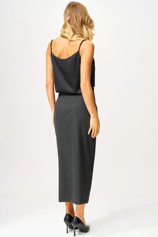 Юбка плотно облегающая вверху и прямая к низу, длиной до середины икр, на подкладке. Пояс притачной, застежка на 1 петлю и пуговицу, потайную тесьму-молнию в левом боковом шве. Перед юбки со средним швом, который заканчивается шлицей, и вытачками. Заднее полотнище с 4-мя вытачками.