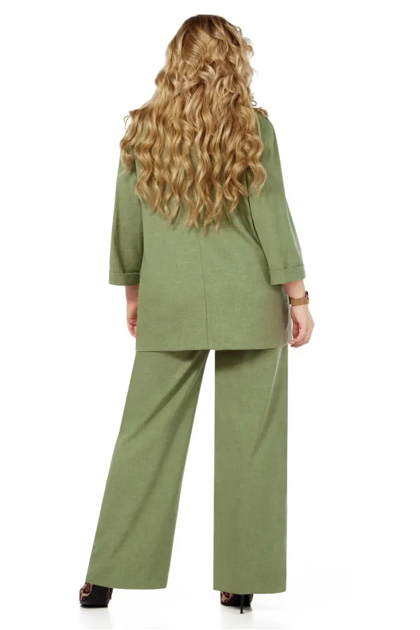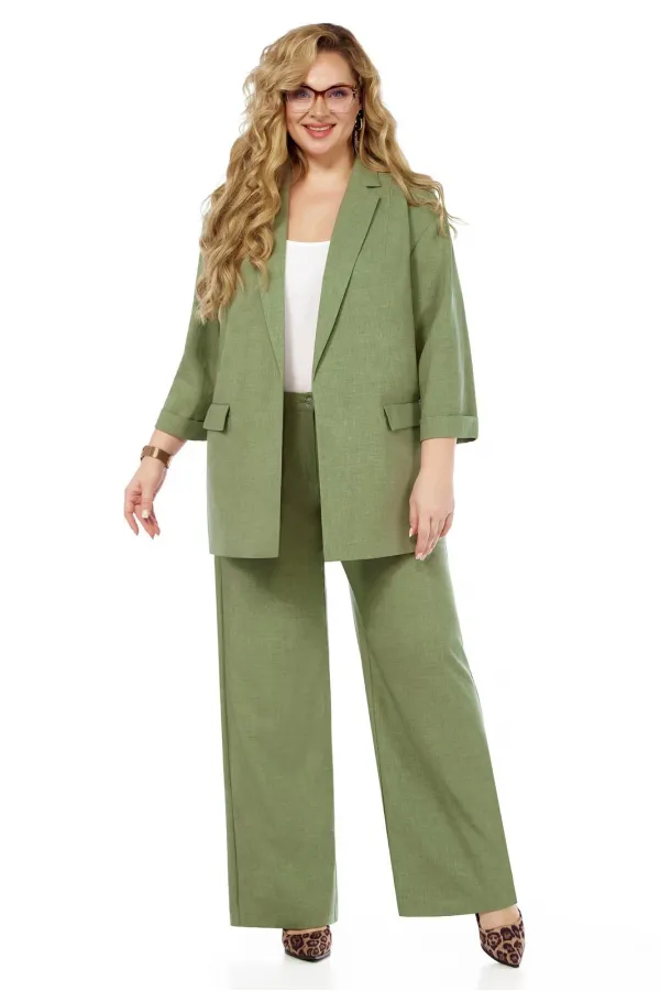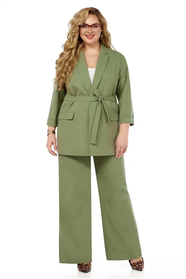 Костюм брючный. Жакет свободного силуэта, без застежки, фиксируется съемным поясом на талии. С отложным воротником и лацканами, внутренние карманы с клапанами, которые при желании можно спрятать. Впереди вытачки от плечевого шва, по спинке центральный шов. Линия плеча приспущена, рукав ¾, манжета с отворотом. Полочки переда - на подкладке. Длинные, свободные от бедра, струящиеся брюки сверху со складками и внутренними карманами, оформлены притачным поясом (сзади на резинке), застежка «молния» + пуговица.