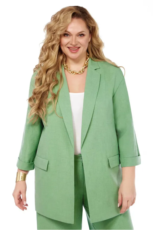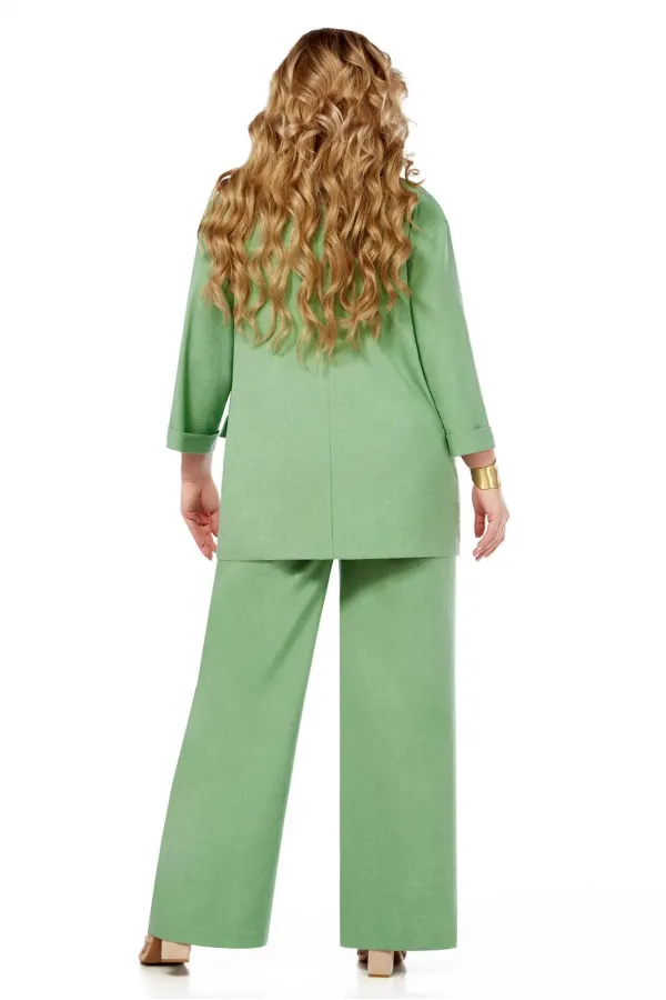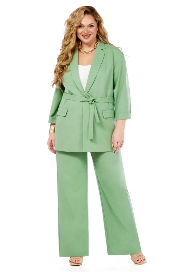 Жакет свободного силуэта, без застежки, фиксируется съемным поясом на талии. С отложным воротником и лацканами, внутренние карманы с клапанами, которые при желании можно спрятать. Впереди вытачки от плечевого шва, по спинке центральный шов. Линия плеча приспущена, рукав ¾, манжета с отворотом. Полочки переда - на подкладке. Длинные, свободные от бедра, струящиеся брюки сверху со складками и внутренними карманами, оформлены притачным поясом (сзади на резинке), застежка «молния» + пуговица.