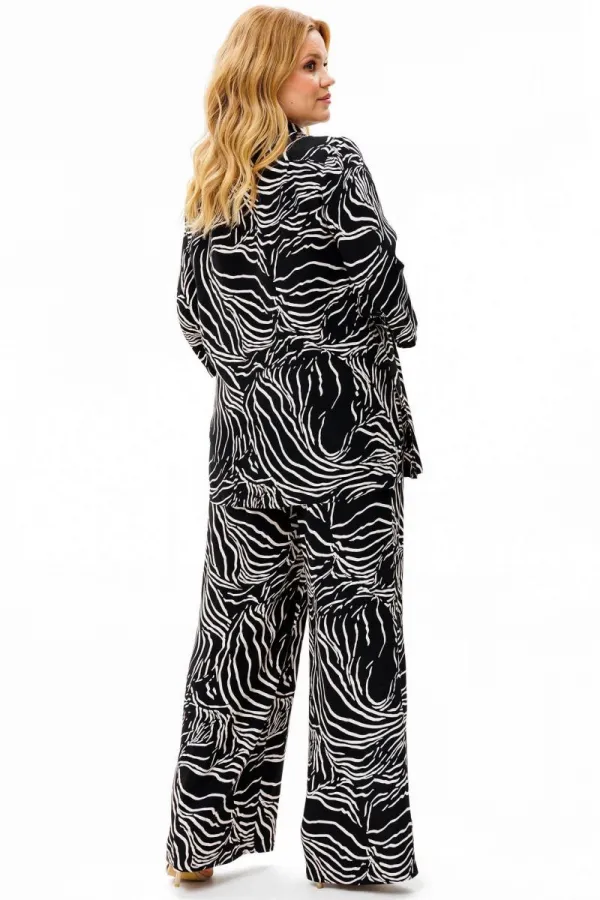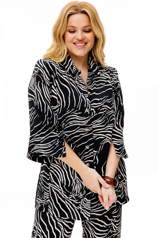 Комплект выполнен из натуральной ткани, типа штапель, с принтом.Жакет в виде рубашки средней длинный, прямого силуэта с воротником на стойке и застежке на пуговицы. Впереди рельефы о проймы + вытачки и внутренние карманы... Читать далее...