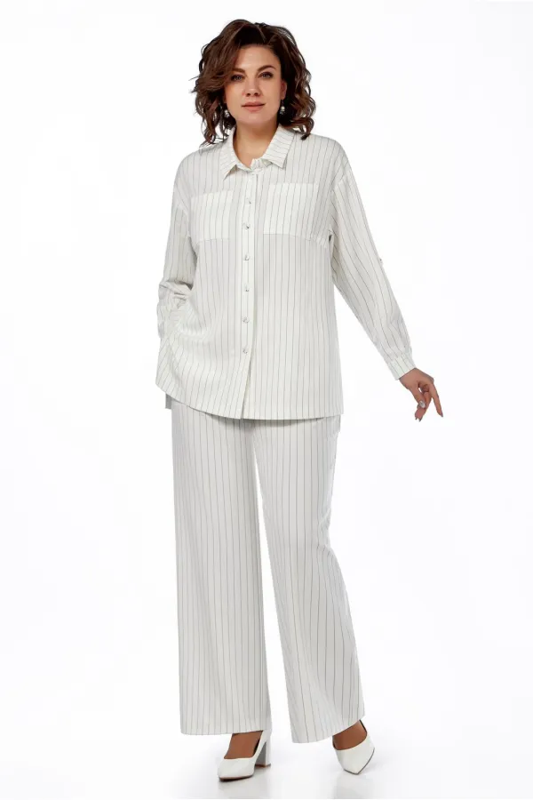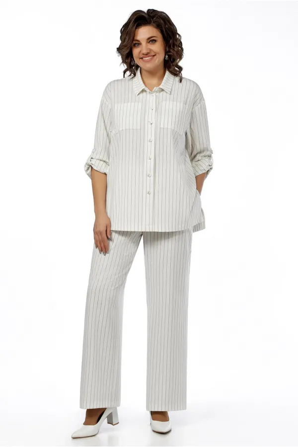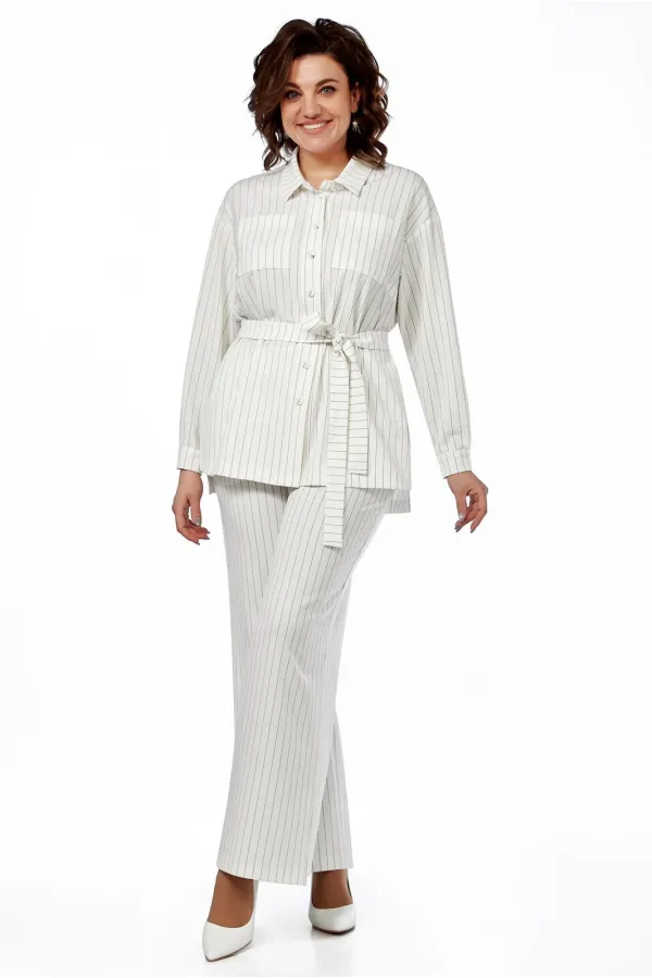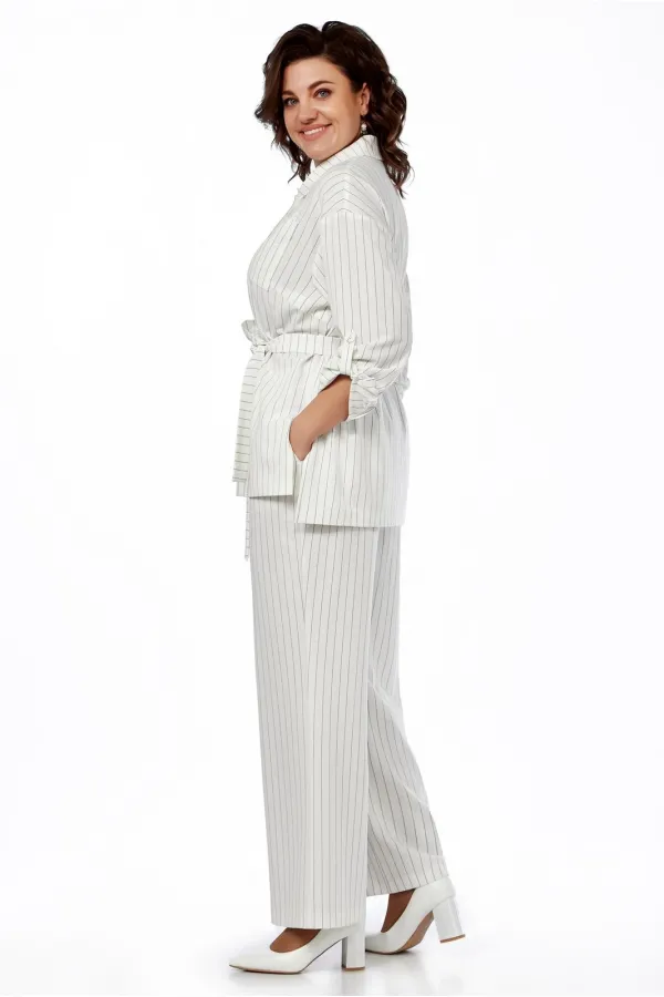 Облегченный жакет в виде рубашки, прямого силуэта, выполнен из костюмной ткани в полоску. Воротник на стойке, застежка по планке на пуговицы, впереди нагрудные вытачки и накладные карманы. Спинка ниже переда, по боковым швам - разрезы. Линия плеча слегка приспущена, рукав длинный, манжета с пуговицей. Рукав, при помощи шлевки, заракатывается и фиксируется, превращаясь в 3/4. Сьемный пояс подчеркивает линию талии.