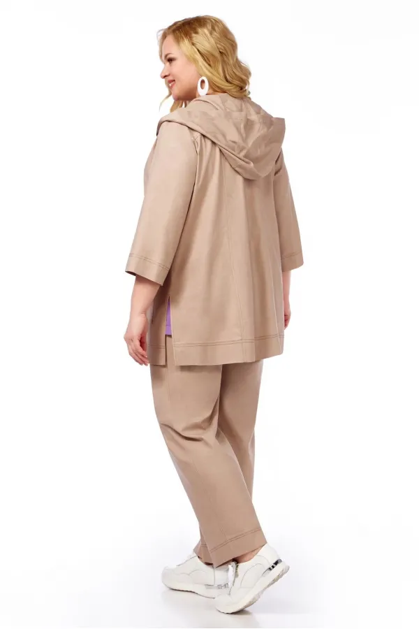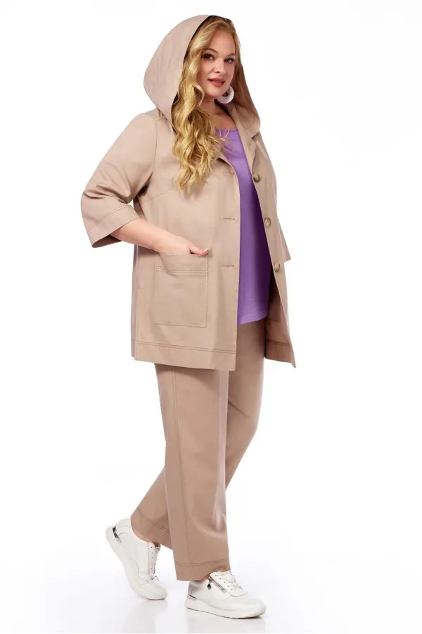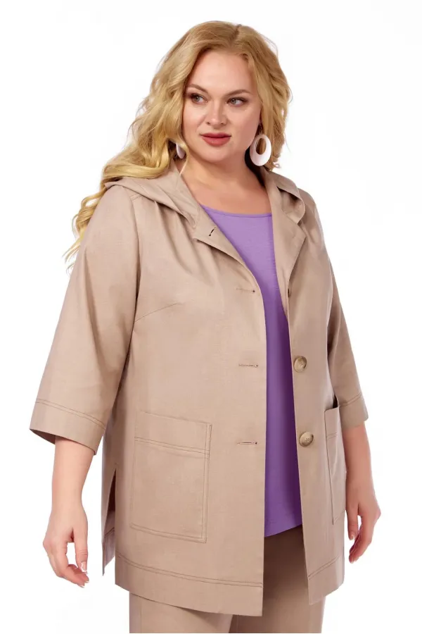 Жакет прямого силуэта выполнен в виде легкой куртки с капюшоном. Застежка на пуговицы, впереди кокетки, у кокеток складочки, нагрудные вытачки, внизу - накладные карманы. По спинке кокетка и рельефы. Рукав 3/4, прямой. По боковым швам - разрезы.