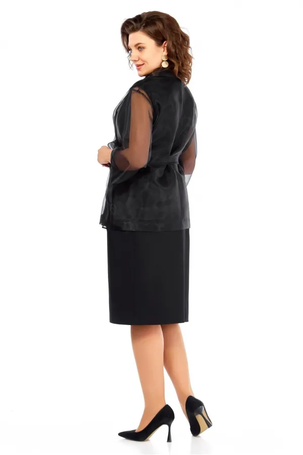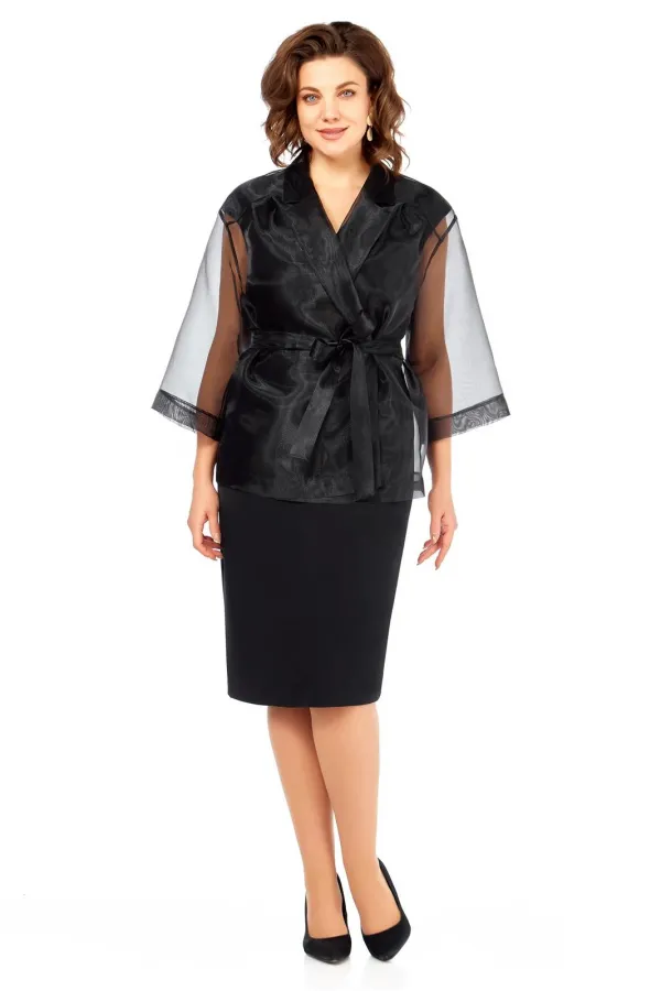 Свободный жакет средней длины из воздушной органзы. Двубортная застежка на запах фиксируется с помощью элегантного пояса, позволяя регулировать степень открытости и подчеркивать линию талии. Линию плеча дополняют кокетки по переду, от которых спускаются мягкие декоративные складки, создающие объемный эффект. Спинка оформлена центральным швом, рукав 7/8.