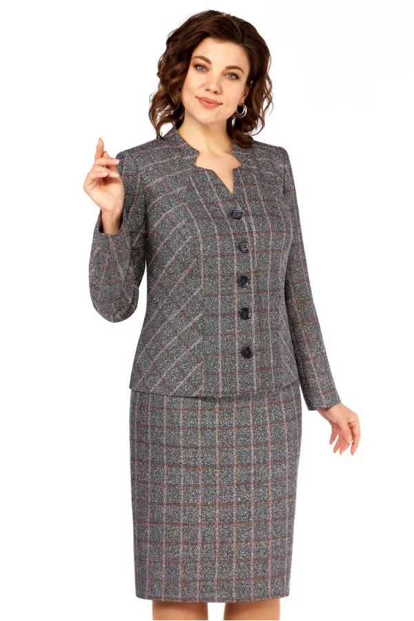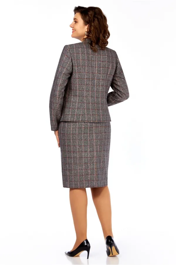 Жакет средней длины, полуприлегающего силуэта, воротник – плосколежащая стойка, небольшой вырез у горловины в виде звездочки. Застежка на пуговицы. Впереди рельефы от горловины. По спинке шов и вытачки на талии. Рукав длинный. Жакет на подкладке. Юбка прямая, средней длины, оформлена притачным поясом (по бокам резинки), на заднем полотнище юбки – шов и шлица, сверху застежка «молния» + пуговица. Юбка на подкладке.