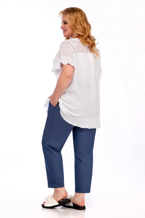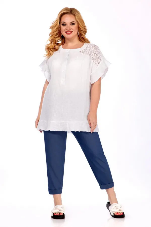 Комплект женский: туника, брюки.Свободная туника выполнена из ткани типа «марлевка». Впереди – кокетка из кружевной ткани, застежка на пуговицы. По спинке тоже кружевная кокетка и складочки.Линия плеча приспущена, неболь... Читать далее...