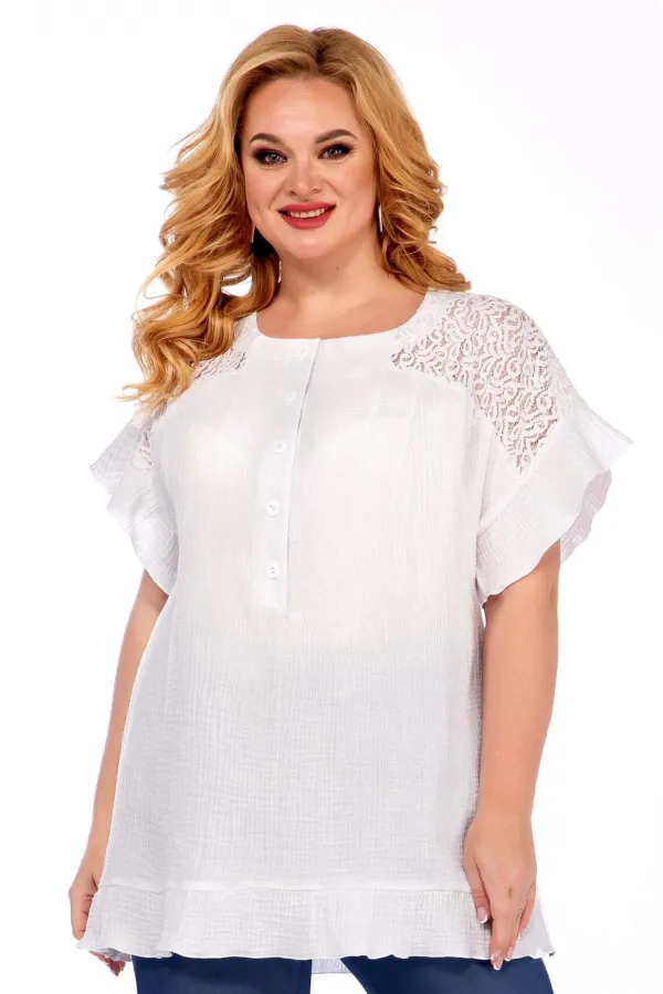 Свободная туника выполнена из ткани типа «марлевка». Впереди – кокетка из кружевной ткани, застежка на пуговицы. По спинке тоже кружевная кокетка и складочки.