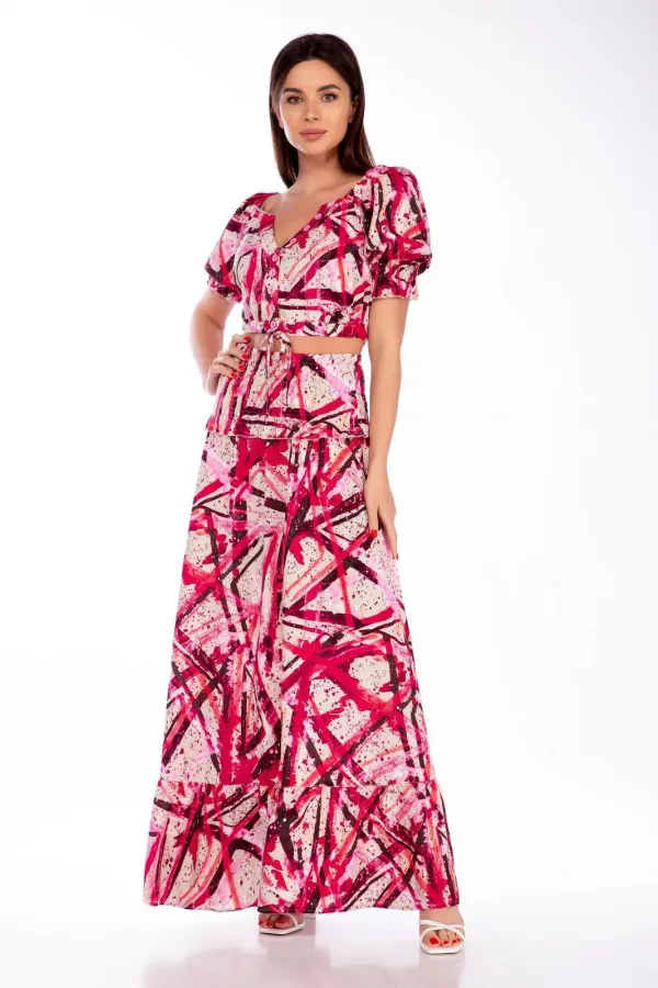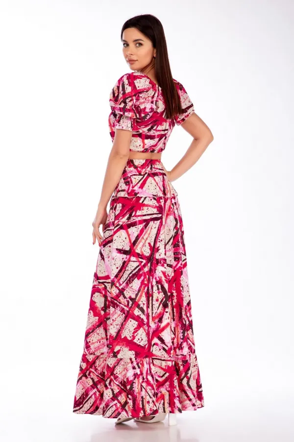 Молодежный комплект двухпредметный из тонкой вискозы для солнечного жаркого лета: юбка, кроп-топ. Юбка-макси, пышная, внизу притачной волан со сборкой. Сверху пояс-кокетка присобрана на лекру в несколько рядов + небольшая рюша. Маленький женственный кроп-топ в сочетании с длинной юбкой создает образ барышни-крестьянки, который очень гармонирует с природой. Фигурный вырез горловины плавно переходит в застежку по планке. Короткий пышный рукав на основе реглана сверху со сборками-складками, внизу присобран на лекру. Кроп-топ присобран шнуром сквозь кулиску. Длина юбки 107 см. Длина кроп-топа от плеча до низа 36 см, длина рукава 32 см. Состав ткани 100% вискоза.