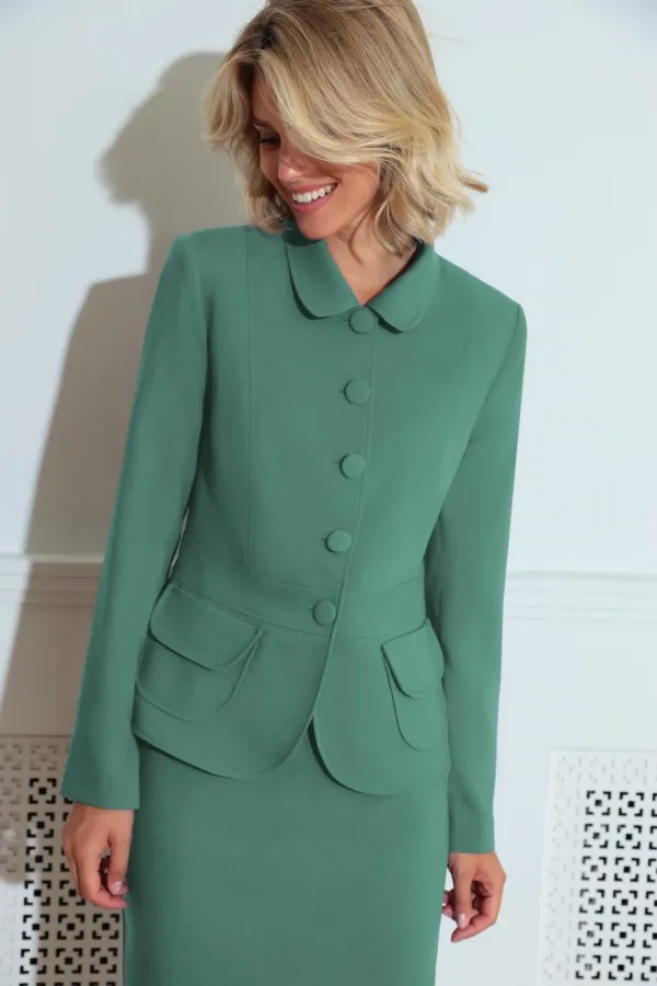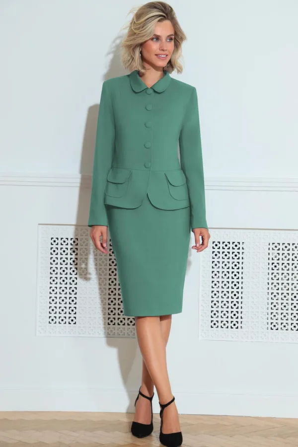 Комплект, состоящий из жакета и юбки. Жакет полуприлегающего силуэта на подкладке с рельефами по переду и спинке, с отрезным поясом по талии и накладными карманами с клапаном. Рукав втачной двухшовный длинный, воротник стояче-отложной. Застежка центральная бортовая на обтяжные пуговицы. Юбка на подкладке, зауженная к низу с притачным поясом и на резинке в размерах 50-54. Застежка в юбке на потайную тесьму-молнию в среднем шве заднего полотнища и шлицей.