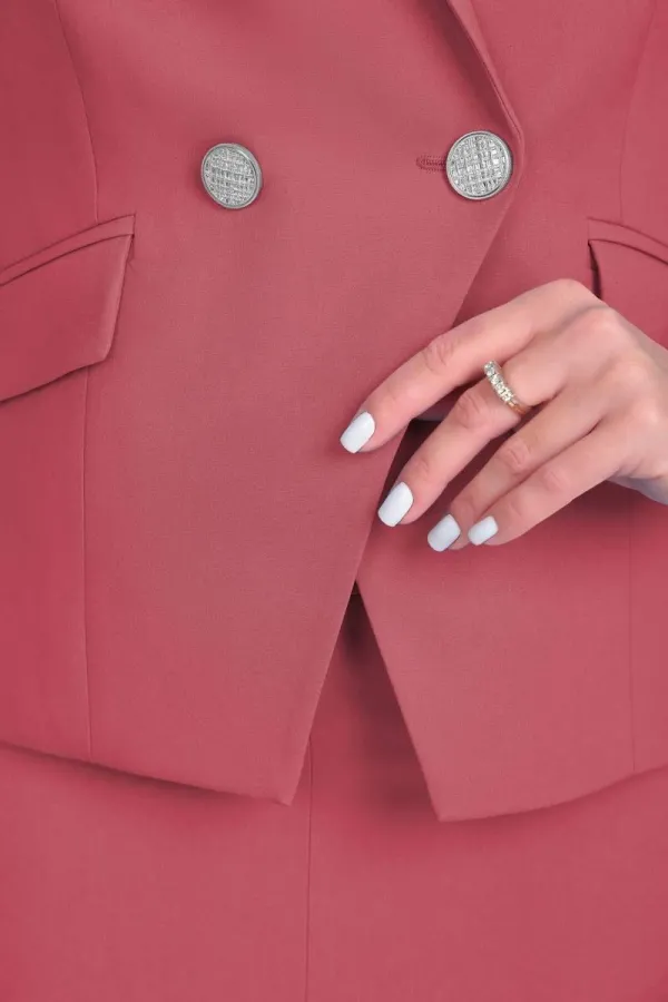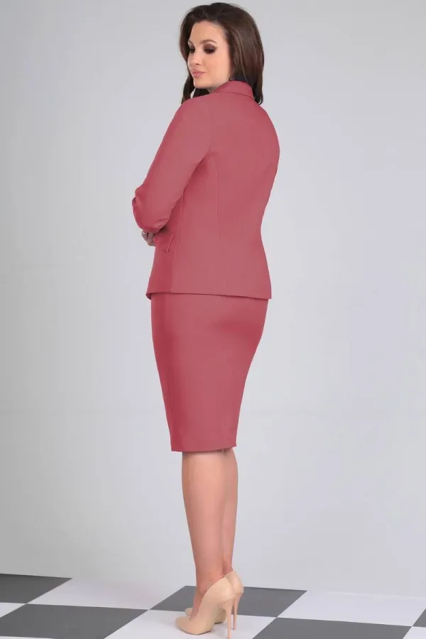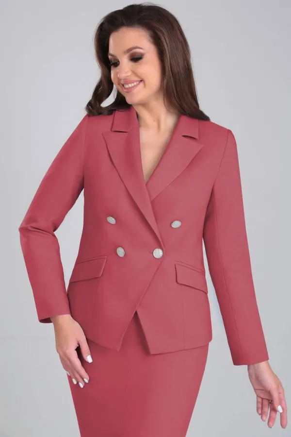 Комплект женский состоящий из жакета, юбки и блузки на бретелях. Жакет полуприлегающего силуэта на подкладке. По переду нагрудная выточка и прорезные функциональные карманы с клапаном. По спинке вертикальные рельефы из проймы и средний шов. Застежка ассиметричная (сверху двубортная, снизу однобортная) бортовая застегивающаяся на петли и декоративные пуговицы. Воротник пиджачного типа. Рукав втачной двухшовный длинный. Юбка на подкладке зауженная к низу на обтачке( без пояса). По переду фигурная кокетка и средний шов с разрезом. Застежка на потайную тесьму-молнию в среднем шве спинки. Топ из трикотажного полотна на узких регулируемых бретелях.