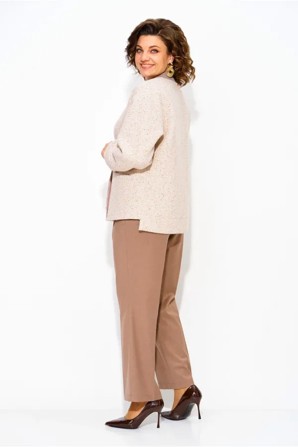 Комплект: жакет+брюки. Женский твидовый жакет, по типу бомбера – стильная женская одежда на каждый день, которая станет отличным дополнением повседневного гардероба. Модель свободного силуэта, со спущенной линией плеча. Рукав длинный, с притачными манжетами по низу. Застежка центральная, на металлическую тесьму-молнию. Горловина обработана трикотажной планкой по типу – бомбера. Низ по полочке фигурный, по спинке удлинен. По полочке расположены рабочие карманы в шве! Свободная оверсайз модель подходит практически под любую фигуру. Модель на шёлковой подкладке! Классические женские брюки, со средней посадкой, прямого покроя от бедра. Застежка – брючная тесьма-молния с обработанным гульфиком. Карманы боковые. Пояс притачной, в боковых участках вставлена резинка на свободу. По переду заутюжены канты. Спинка с Талиевыми выточками. Подгибка брюк –– 4 см. Длина по спинке – 70 см, рукав – 62 см. Брюки 102-104 см.