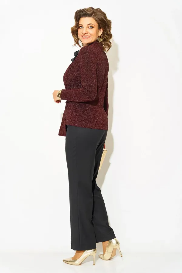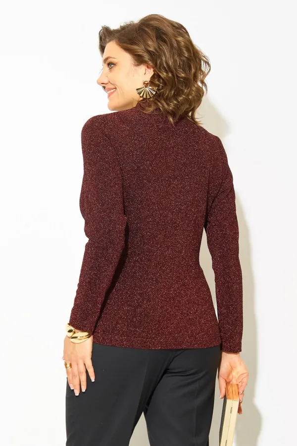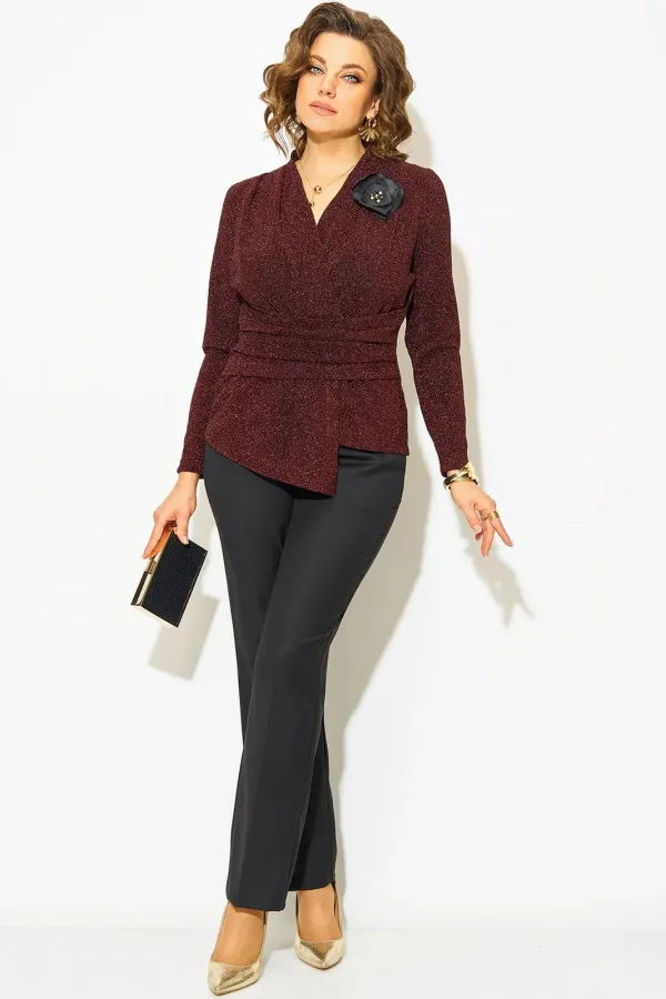 Эффектная нарядная блузка, выполнена из мягкого трикотажа с мерцающим эффектом. Такой дизайн ткани придает необычное переплетение нитей: с изнанки мягкий однотонный трикотаж! Вырез горловины мягкая стойка, переходящая в V-образный вырез с имитацией запаха. По полочке заложены декоративные складки для комфортного прилегания изделия. Низ блузки ассиметричный. Пояс декорирован задрапированным поясом из основной ткани, что зрительно стройнит и скрывает все недостатки фигуры. Рукав в точной, длинный. Спинка приталенная, без особенностей. К блузке предусмотрен съемная брошь, в виде цветка. Отлично сочетается с базовыми однотонными брюками из коллекции Лилиана.