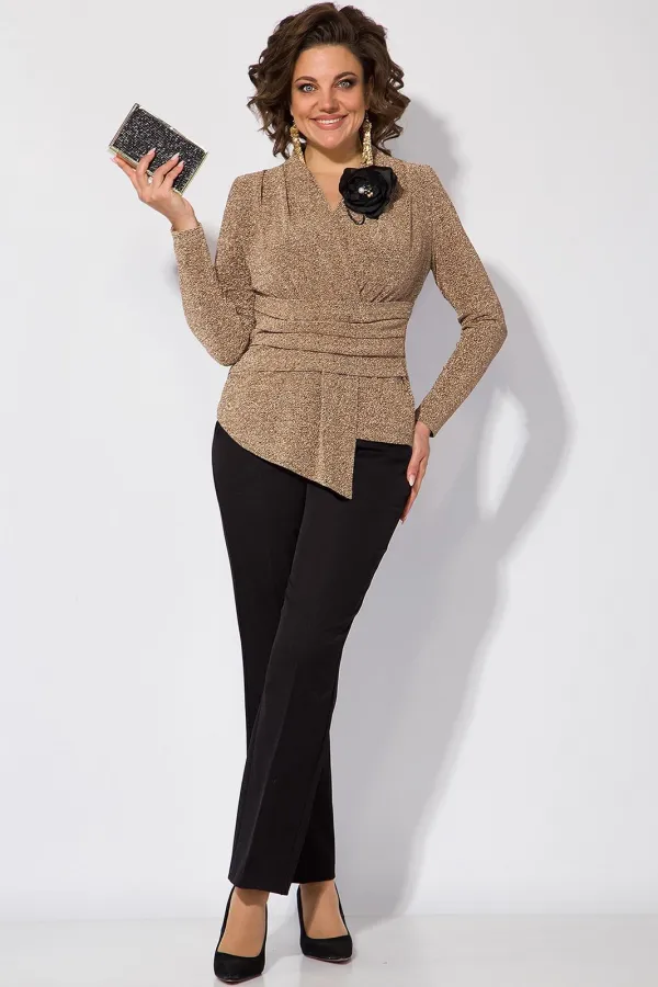 Эффектная нарядная блузка, выполнена из мягкого трикотажа с мерцающим эффектом. Такой дизайн ткани придает необычное переплетение нитей: с изнанки мягкий однотонный трикотаж! Вырез горловины мягкая стойка, переходящая в V-образный вырез с имитацией запаха. По полочке заложены декоративные складки для комфортного прилегания изделия. Низ блузки ассиметричный. Пояс декорирован задрапированным поясом из основной ткани, что зрительно стройнит и скрывает все недостатки фигуры. Рукав в точной, длинный. Спинка приталенная, без особенностей. К блузке предусмотрен съемная брошь, в виде цветка. Отлично сочетается с базовыми однотонными брюками из коллекции Лилиана.