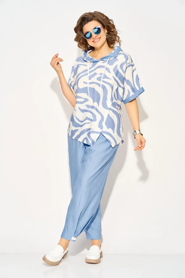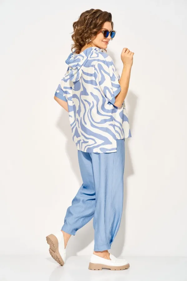 Стильный летний костюм, состоящий из удлиненной туники свободного покроя и брюк. Оригинальная туника из вискозы добавлением льна. Модель с цельнокроеным укороченным рукавом и ассиметричным подрезом по полочке. Модель с легким капюшоном и кулисой на шнуровке. Низ изделия разноуровневый. Спинка цельная. В комплекте свободные брючки, завышенной посадки. Брюки на притачном поясе с круговой резинкой. Имеются боковые карманы. Низ с заложенными складками, что придает изделию более спортивный образ. Длина туники по спинке - 68 см, рукав – около 30 см.