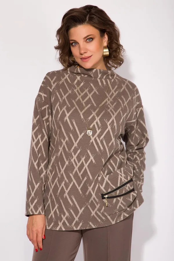Костюм состоит из жакета и брюк. Жакет полуприталенного силуэта с застежкой на молнию. Воротник стойка. Рукав на спущенной линии плеча полной длины. По талии и низу рукава предусмотрена кулиску с утяжкой. По полочке расположены накладные карманы с клапаном. По бокам предусмотрены разрезы. В комплекте брюки прямого кроя с заутюженными кантами. Брюки на притачном поясе с круговой резинкой по талии. В брюках имеются боковые карманы.
