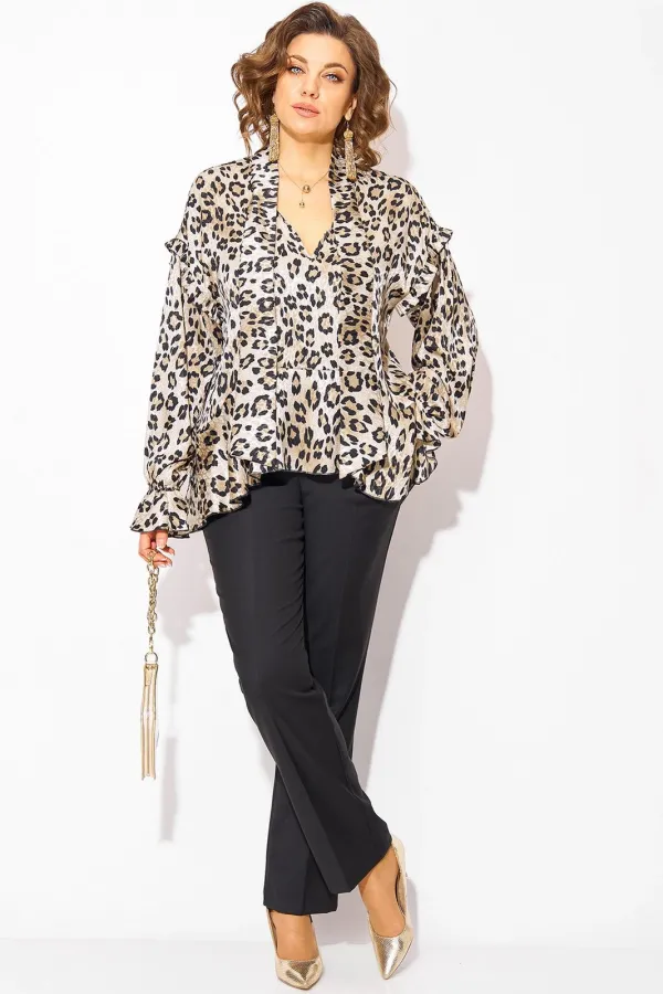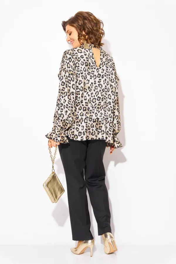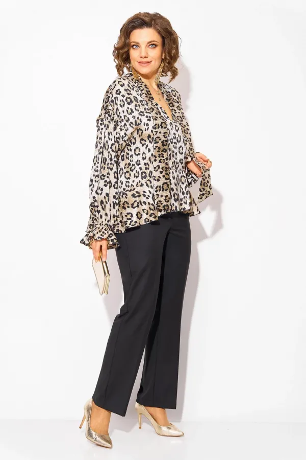 Леопардовая нарядная блузка в стиле «Оверсайз» – это модный предмет гардероба, который ассоциируется с уверенностью и энергией. Модель свободного силуэта трапеция, с ассиметричной линией низа. Линия горловины v-образная, переходит в мягкую стойку-бант. Рукав длинный на резинке, на спущенном плечевом поясе. Низ изделия и низ рукава оформлен мягким воланом. Спинка с небольшим v-образным вырезом. Брюки в комплекте прямого фасона, средней посадки. Пояс притачной, в боковых участках вставлена резинка. Застежка – брючная тесьма-молния с обработанным гульфиком. По переду заутюжены канты.
