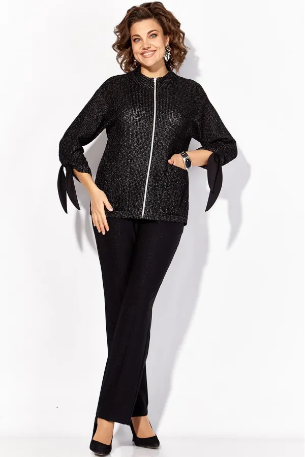 Эффектный, нарядный облегченный жакет, выполнен из вязанного трикотажа с эффектом легкого мерцания. Модель свободного силуэта, с рукавом длиной ¾-ти на спущенном плечевом поясе. Горловина обработана полулежащей стойкой. Застежка центральная на молнию. По полочке расположены аккуратные накладные карманы. Низ изделия оформлен притачной планкой. Изюминкой данной моделям служит необычные паты по рукаву с завязкой в виде банта. Этот вязанный трикотажный жакет - идеальный вариант для создания стильного и привлекательного романтического образа! Мягкий и нежный материал делает его очень приятным на ощупь, теплым и уютным, а легкое мерцание придает свою изюминку. Отлично сочетается с классическими прямыми брюками из базовой коллекции от бренда Лилиана!