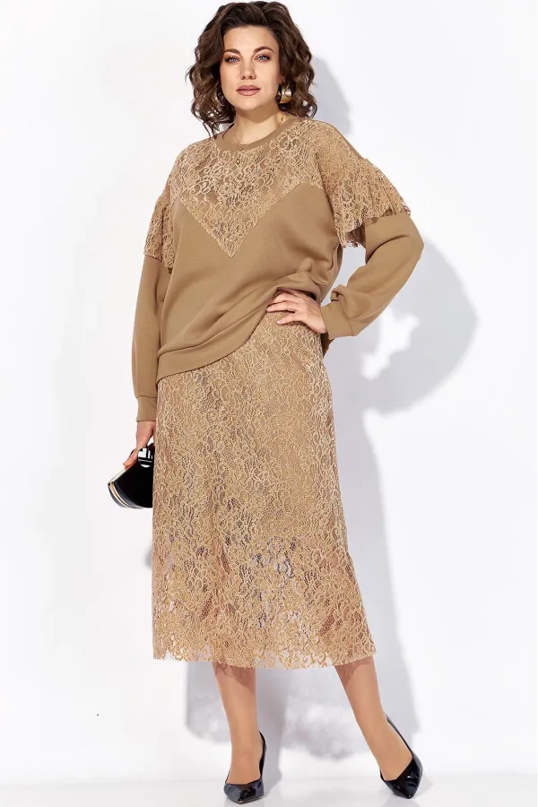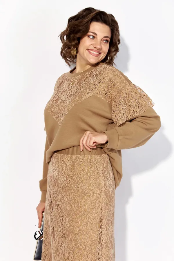 Представляем вашему вниманию уютный теплый женский костюм от бренда «Лилиана»! Он состоит из стильного джемпера и клешеной юбки миди– идеальный выбор для современных женщин, стремящихся совмещать комфорт и элегантность в повседневной жизни. Джемпер с округлым вырезом горловины, на мягкой планке свободного силуэта, со спущенной линией плеча. Рукав длинный, на притачной манжете с заложенными мягкими складками. Линия декольте украшена кокеткой из кружева. По плечу идет мягкий кружевной волан на сборку, что придает романтичность образу. Юбка выполнена из трикотажного кружева, на подкладке. Пояс круговая резинка.