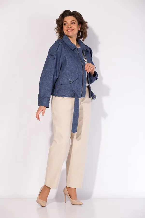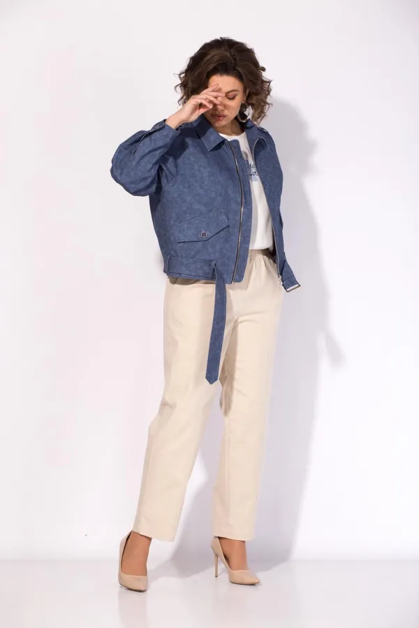 В комплекте классические женские брюки, со средней посадкой, прямого покроя от бедра. Застежка – брючная тесьма-молния с обработанным гульфиком. Карманы боковые. Пояс притачной, в боковых участках вставлена резинка на свободу. По переду заутюжены канты. Спинка с Талиевыми выточками. Подгибка брюк –– 4 см.