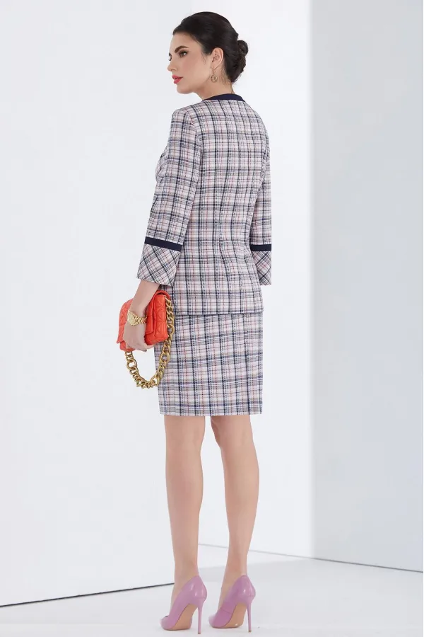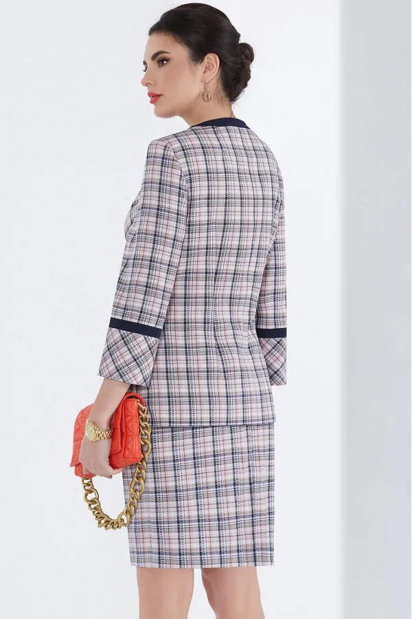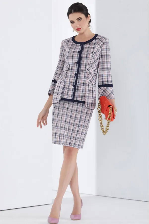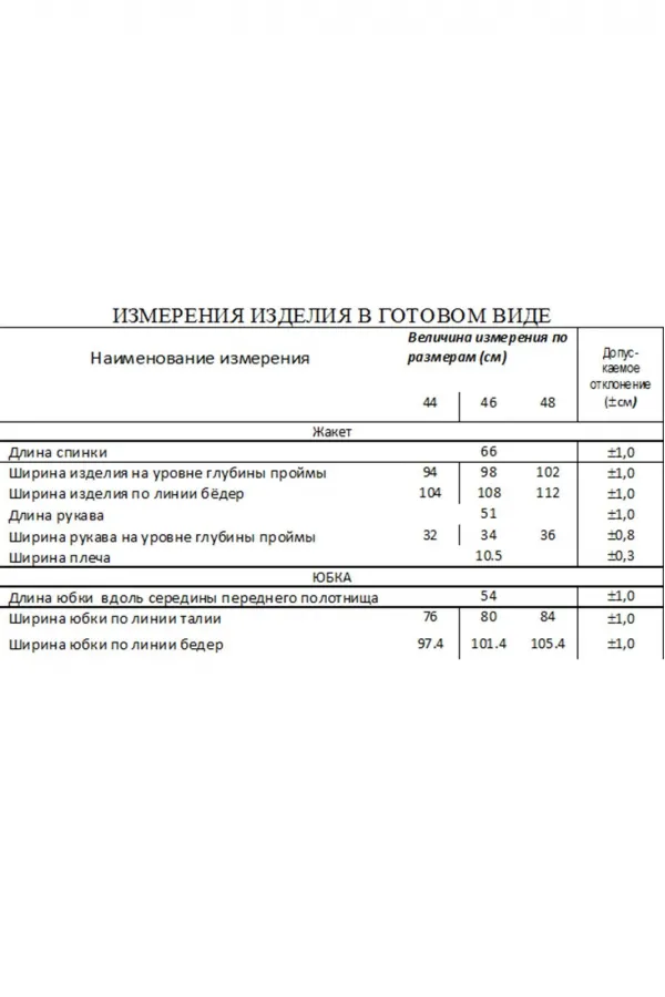 Костюм юбочный. Жакет с округлым вырезом горловины, фигурным низом и центральной застёжкой на петли и пуговицы. Перед с декоративными деталями по низу и клапанами. Спинка со средним швом и талиевыми вытачками. Рукава втачные с отрезными деталями по низу. Жакет на подкладке. Юбка на обтачке. Заднее полотнище с потайной молнией и разрезом в среднем шве. Юбка на подкладке.