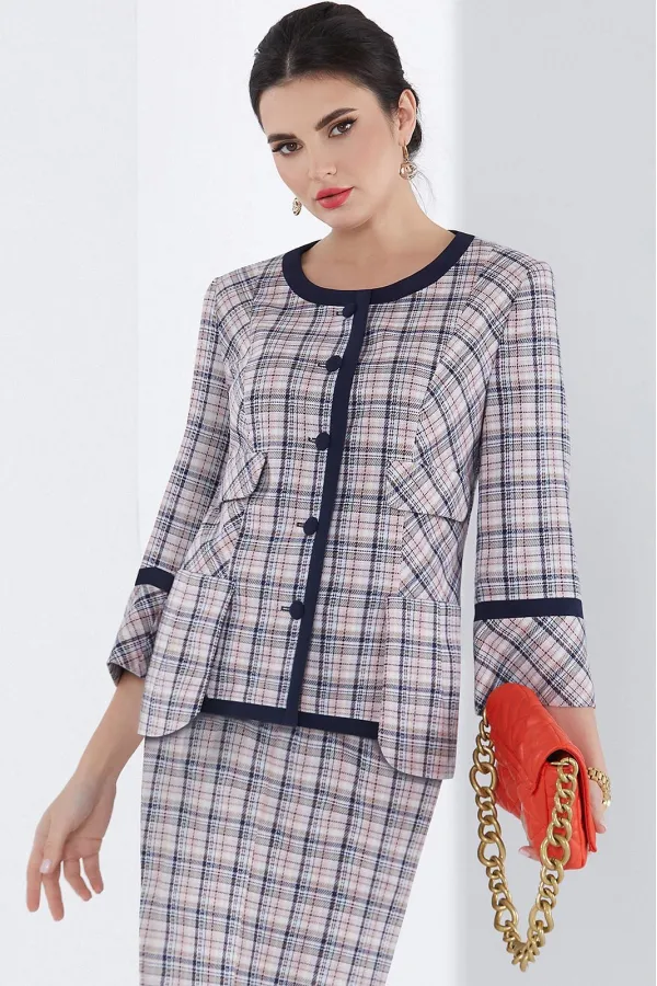 Костюм юбочный. Жакет с округлым вырезом горловины, фигурным низом и центральной застёжкой на петли и пуговицы. Перед с декоративными деталями по низу и клапанами. Спинка со средним швом и талиевыми вытачками. Рукава вта... Читать далее...