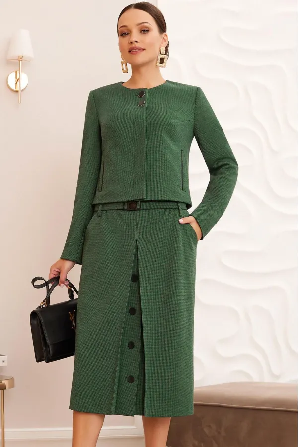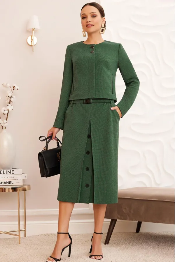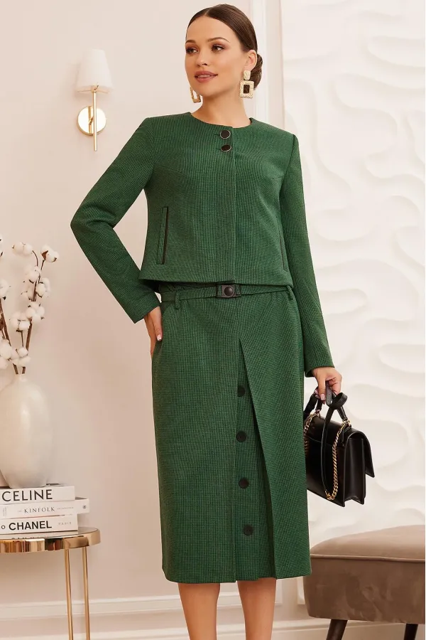 Костюм юбочный Жакет с округлым вырезом горловины и центральной застёжкой на две петли и две пуговицы и потайные пуговицы. Переднее полотнище с карманами с листочками. Рукава втачные. Жакет на подкладке. Юбка на притач... Читать далее...