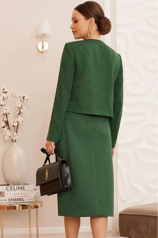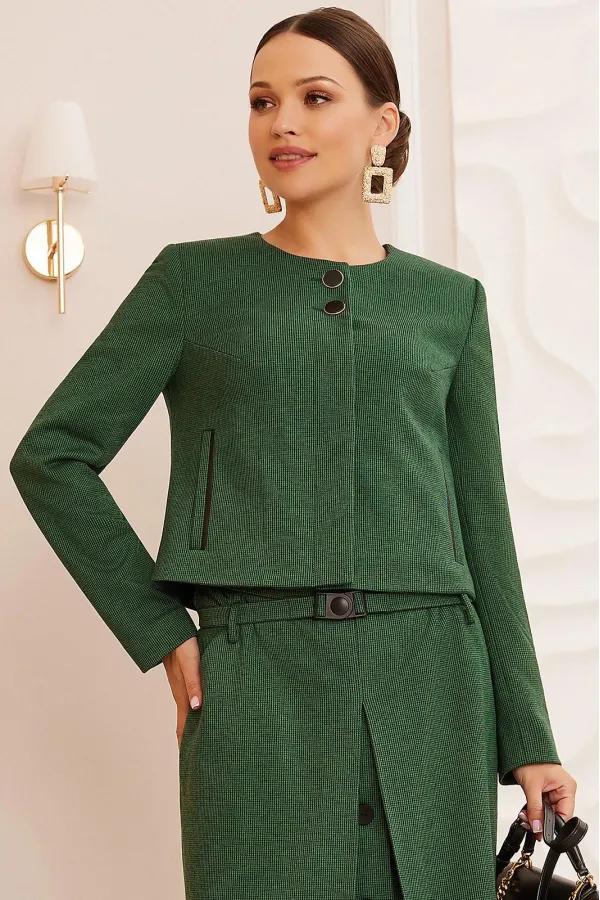 Жакет с округлым вырезом горловины и центральной застёжкой на две петли и две пуговицы и потайные пуговицы. Переднее полотнище с карманами с листочками. Рукава втачные. Жакет на подкладке.