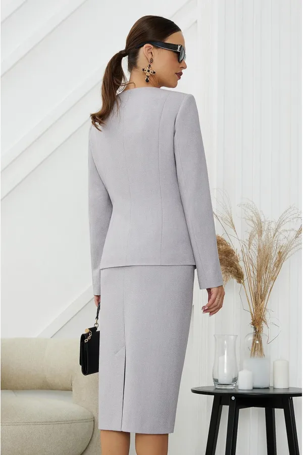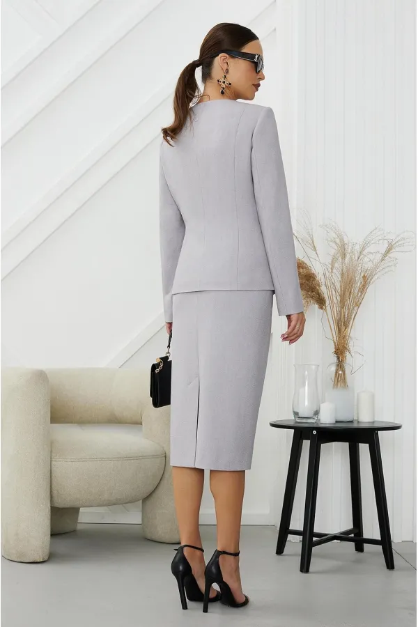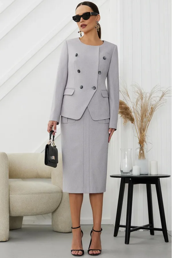Костюм юбочныйЖакет с округлым вырезом горловины и двубортной застёжкой на петли с пуговицами и пришивные кнопки. Перед с карманами с клапанами в нижней части и фигурным низом. Спинка со средним швом и двумя рельефами. Р... Читать далее...