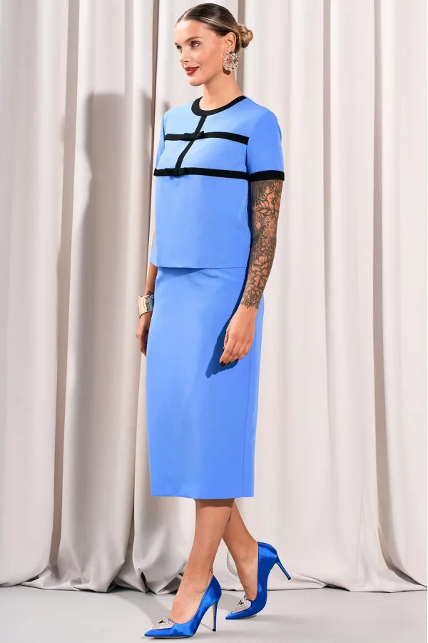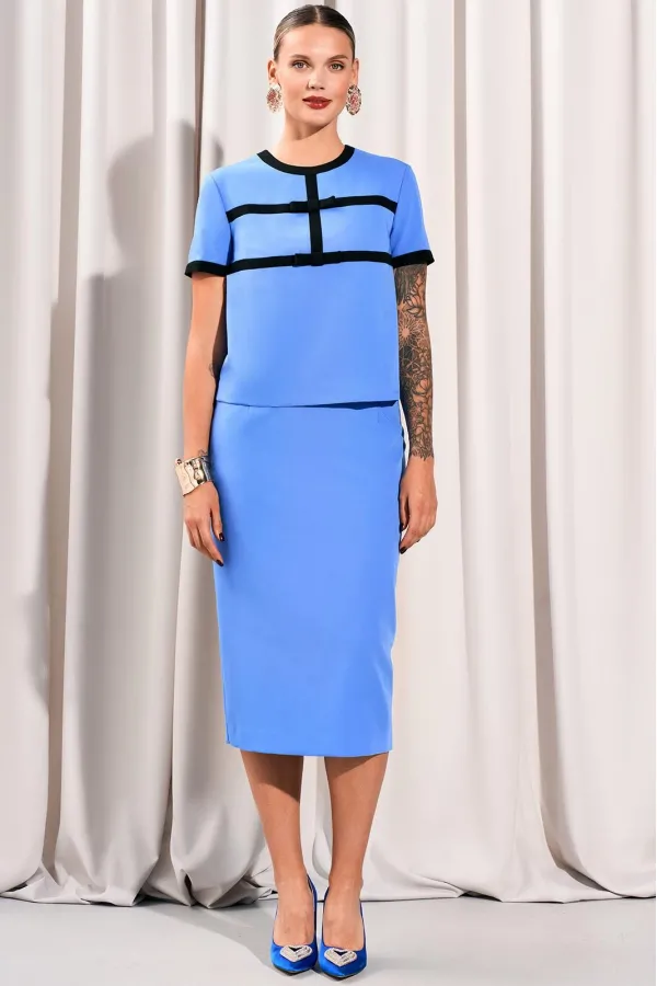 Костюм юбочный.Блуза с округлым вырезом горловины. Перед с декоративными отрезными деталями и бантами контрастного цвета. Спинка с потайной молнией в среднем шве. Рукава втачные с контрастной отделочной деталью по низу.Ю... Читать далее...