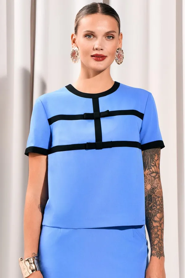 Блуза с округлым вырезом горловины. Перед с декоративными отрезными деталями и бантами контрастного цвета. Спинка с потайной молнией в среднем шве. Рукава втачные с контрастной отделочной деталью по низу.