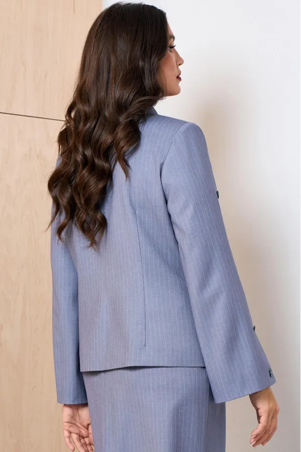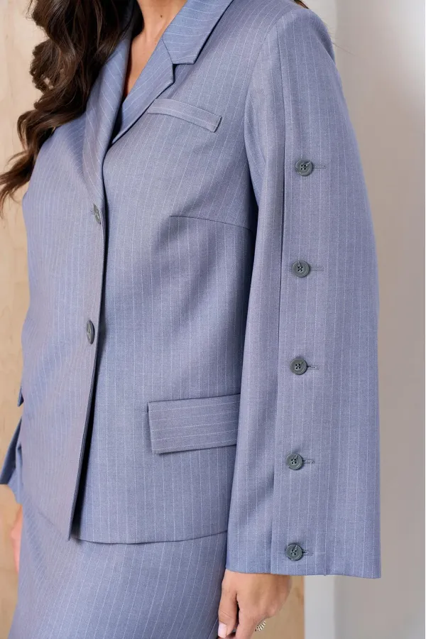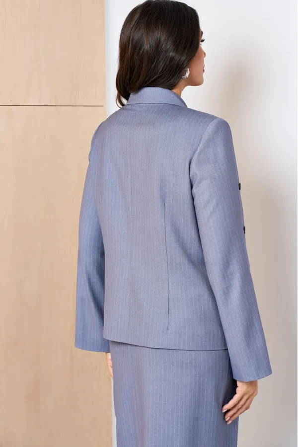 Жакет со стояче-отложным воротником пиджачного типа и смещённой застёжкой на петли и пуговицы. Перед с карманами с клапанами в нижней части. Спинка со средним швом и талиевыми вытачками. Рукава втачные с пуговицами (три нижних из которых расстегиваются). Жакет на подкладке.