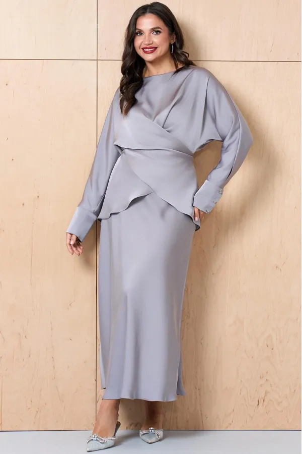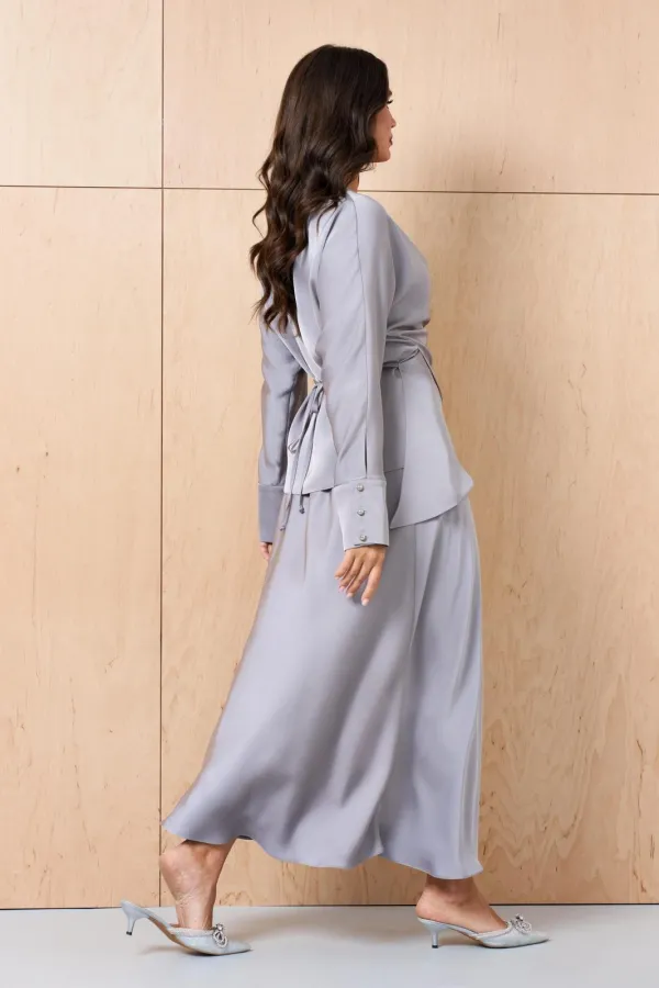 Блуза с цельнокроеными рукавами и фигурным низом. Манжеты рукавов с пуговицами по низу. Изделие с разрезами по боковым швам и завязками по спинке.Юбка на обтачке и с застёжкой на молнию по боковому шву.... Читать далее...