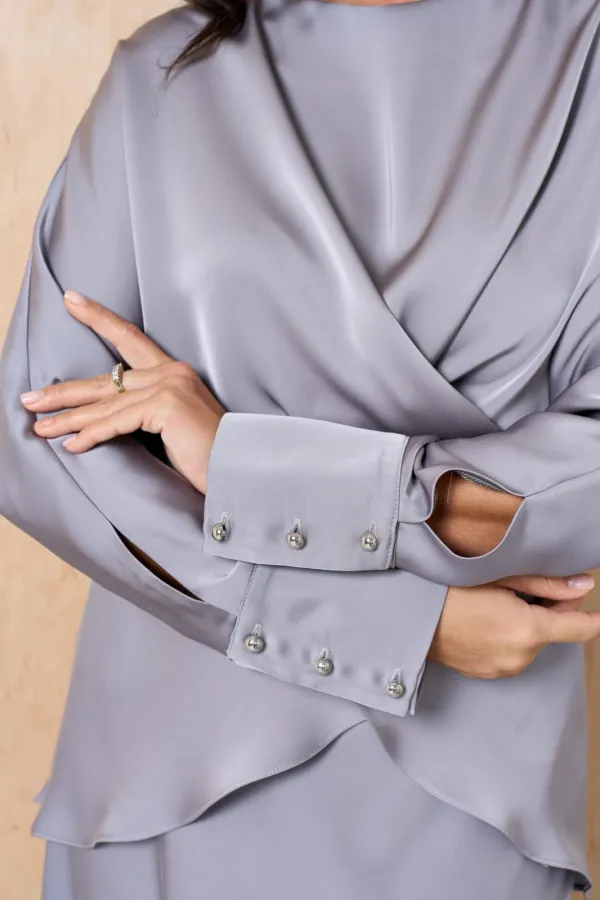 Блуза с цельнокроеными рукавами и фигурным низом. Манжеты рукавов с пуговицами по низу. Изделие с разрезами по боковым швам и завязками по спинке.