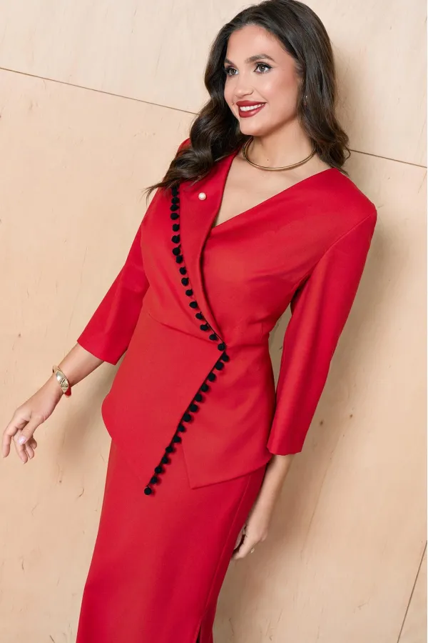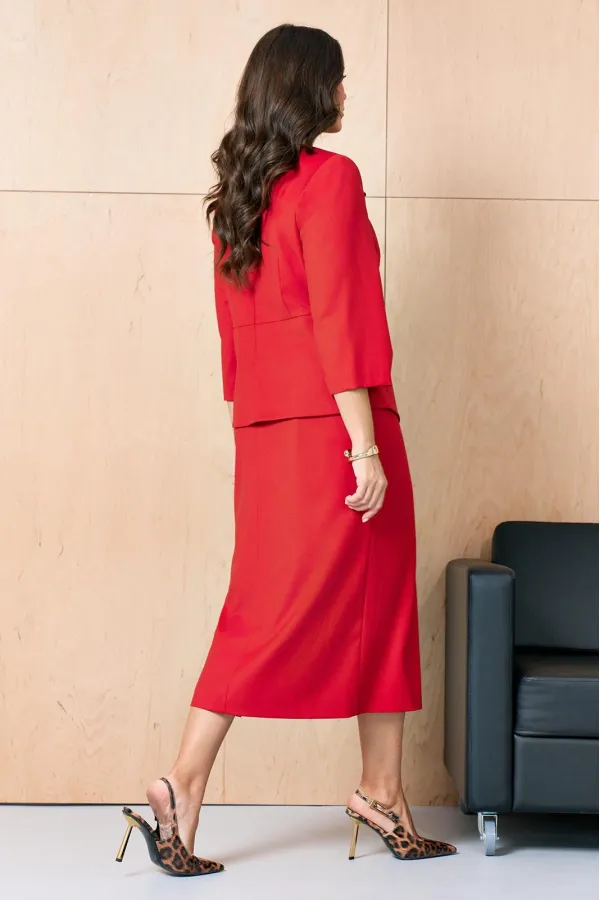 Костюм юбочный.Блуза с V- образным вырезом горловины, фигурным низом и баской. Перед с брошью на лацкане и пришивным декором по краю. Спинка с потайной молнией в среднем шве и талиевыми вытачками до баски. Рукава втачные... Читать далее...