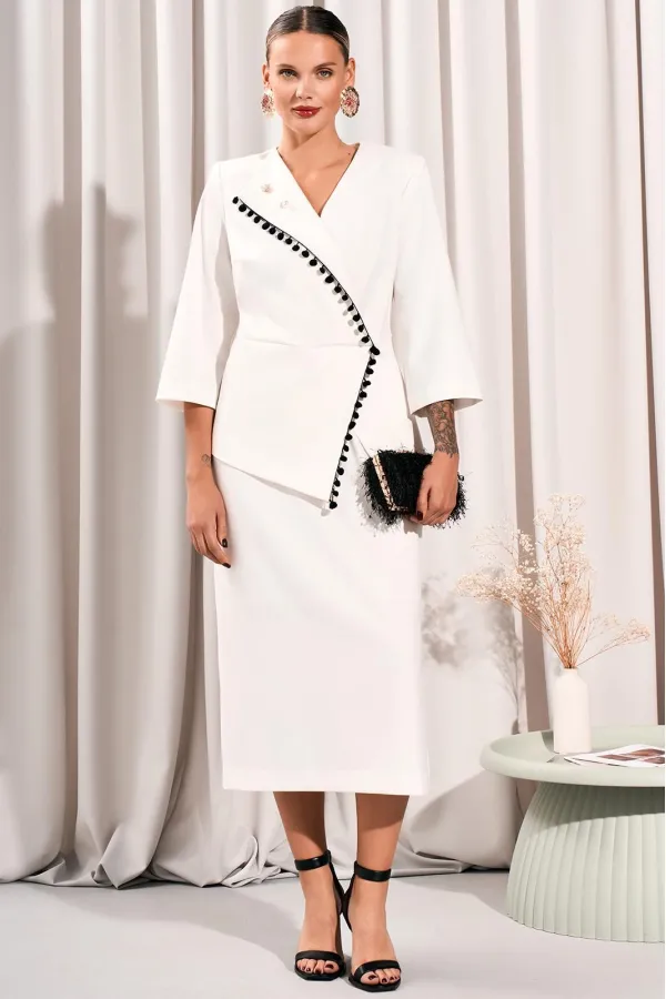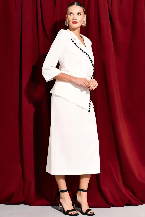 Костюм юбочный.Блуза с V- образным вырезом горловины, фигурным низом и баской. Перед с брошью на лацкане и пришивным декором по краю. Спинка с потайной молнией в среднем шве и талиевыми вытачками до баски. Рукава втачные... Читать далее...