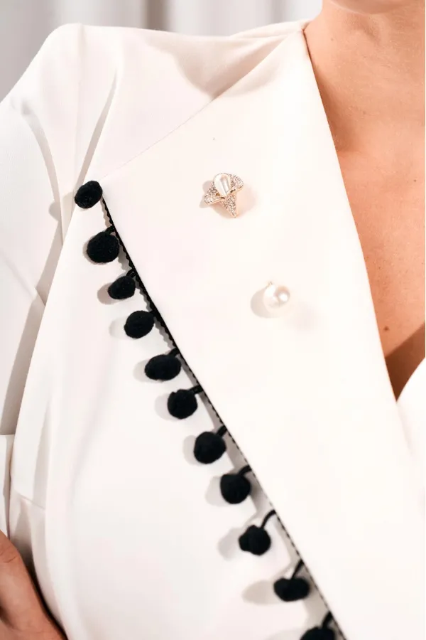 Блуза с V- образным вырезом горловины, фигурным низом и баской. Перед с брошью на лацкане и пришивным декором по краю. Спинка с потайной молнией в среднем шве и талиевыми вытачками до баски. Рукава втачные.