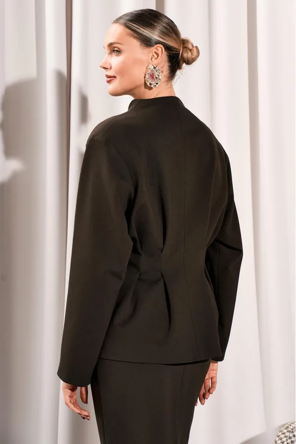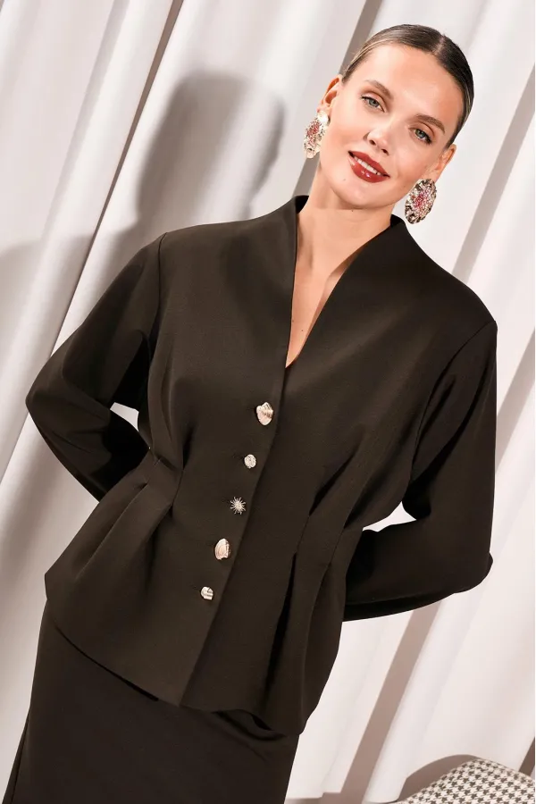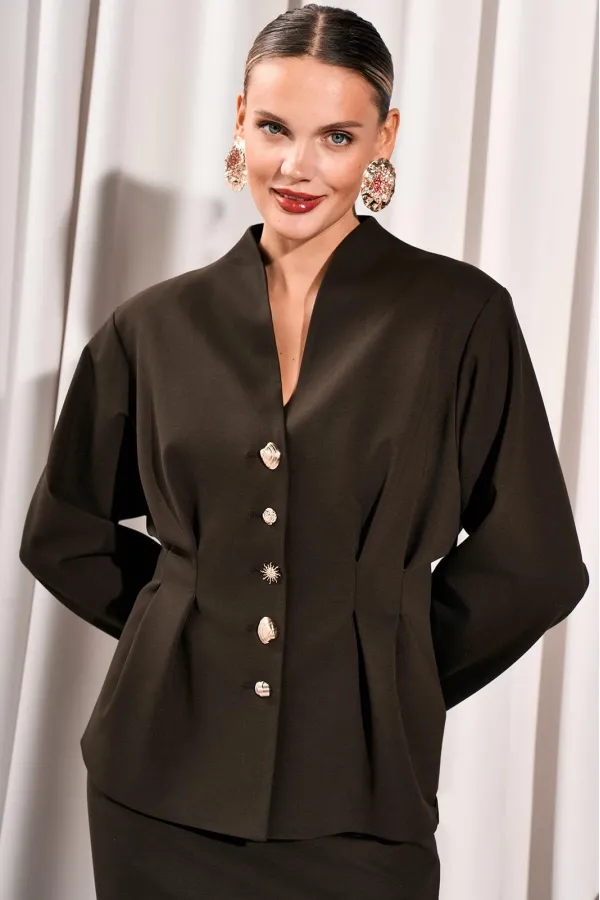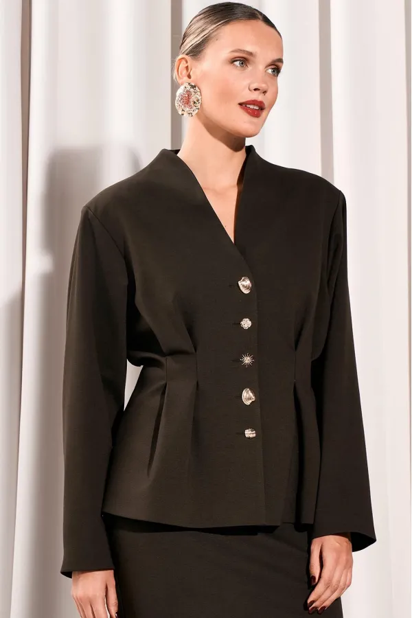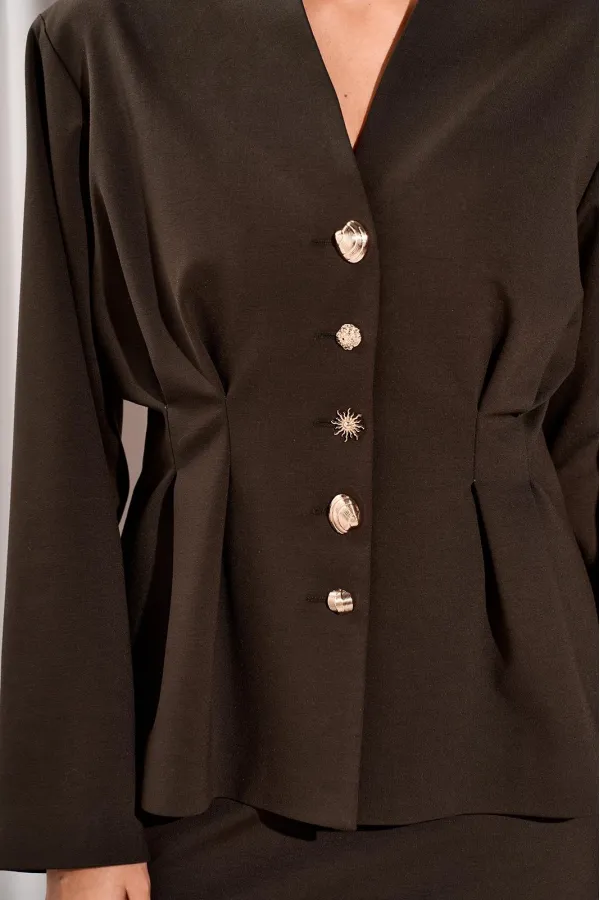 Жакет имеет современный силуэт: чуть расширенная линия плеча и более облегающий в районе талии. Изделие с цельнокроеной стойкой. По переду и спинке жакет застрочен по талии. Спинка со средним швом. Акцент изделия - это дизайнерские пуговицы. Каждая пуговица имеет свой оригинальный вид, объединяясь золотым цветом, создаётся современное уникальное сочетание. Рукава втачные. Жакет на подкладке.