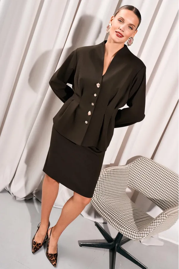 Костюм юбочный.Жакет имеет современный силуэт: чуть расширенная линия плеча и более облегающий в районе талии. Изделие с цельнокроеной стойкой. По переду и спинке жакет застрочен по талии. Спинка со средним швом. Акцент ... Читать далее...