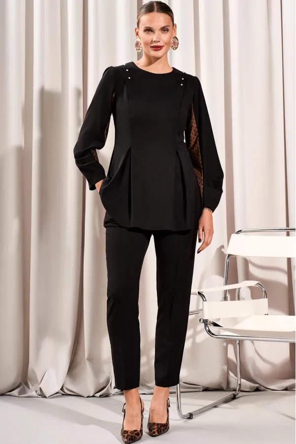 Свитшот с округлым вырезом горловины и складками от рельефов по переду и спинке. Перед со стразами в верхней части. Спинка с потайной молнией в среднем шве. Рукава втачные со складками по окату и со складками нижней части рукава, и с деталью из декоративной сетки и подложки.
