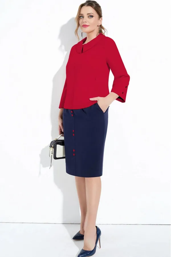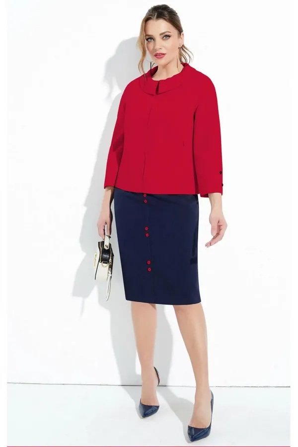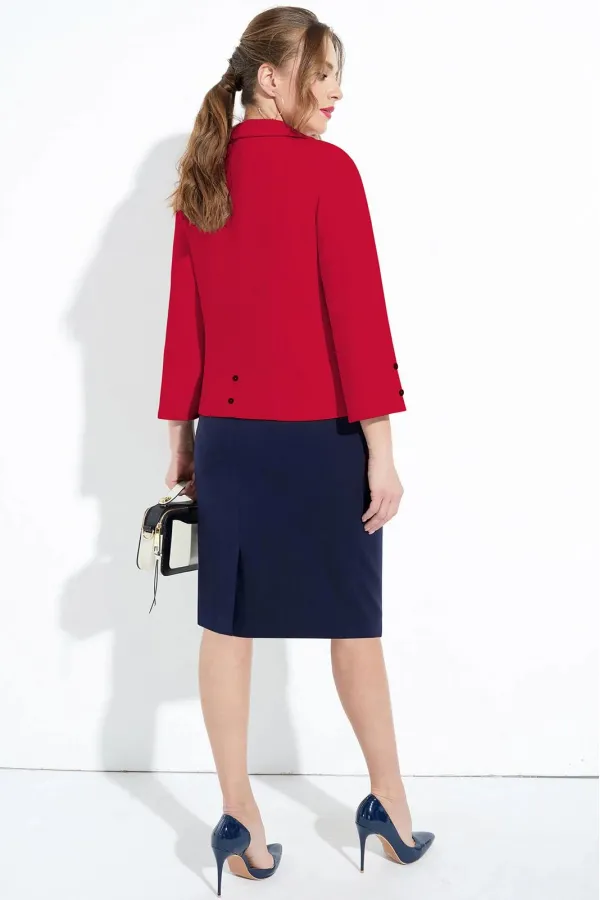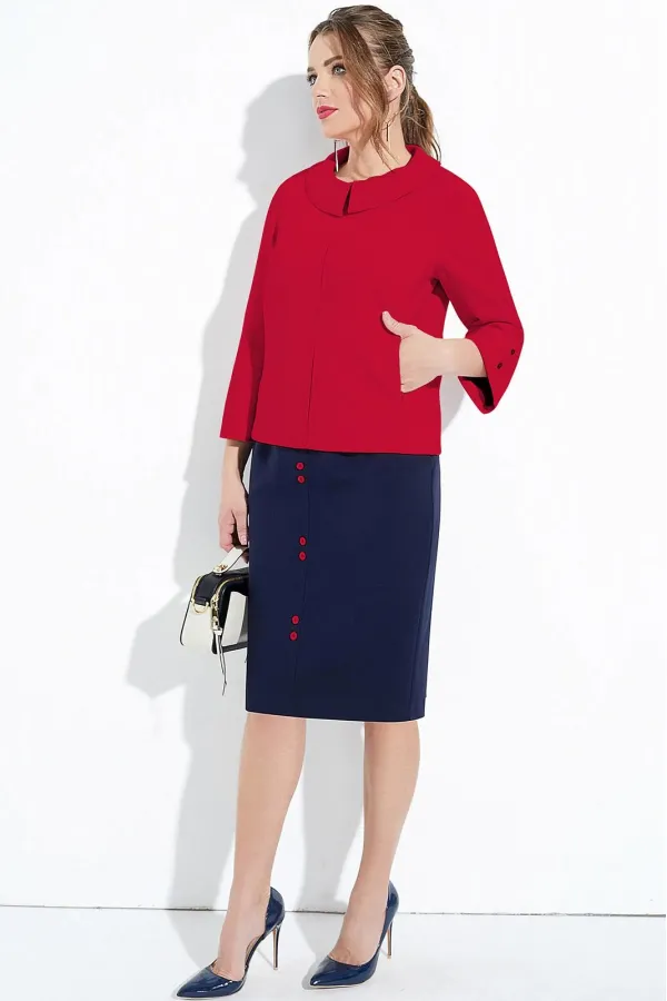 Современный костюм в стиле минимализм создаст неповторимый модный образ и подчеркнет ваш индивидуальный стиль. Жакет «Спенсер» на молнии в стиле 60-х годов. Воротник отложной мягкой формы. Рельефы немного смещены к боку, в рельефных швах выполнены карманы с застежкой на потайную молнию. Жакет прямого силуэта, с легким приталиванием, застегивается на металлическую молнию (молния спрятана под припуски швов европейская обработка). Рукав реглан с отрезной широкой манжетой. На манжете пришиты контрастные маленькие пуговицы в цвет юбки. Спинка со средним швом и вертикальными рельефами. Внутри на обтачке выполнена маленькая, аккуратная вышивка, дизайнерская штрих. Юбка с отрезным поясом от талиевых вытачек по переду и косыми карманами. По переду имитация запаха, сзади средний шов и шлица. Застежка в среднем шве спинки. Жакет и юбка на подкладке.